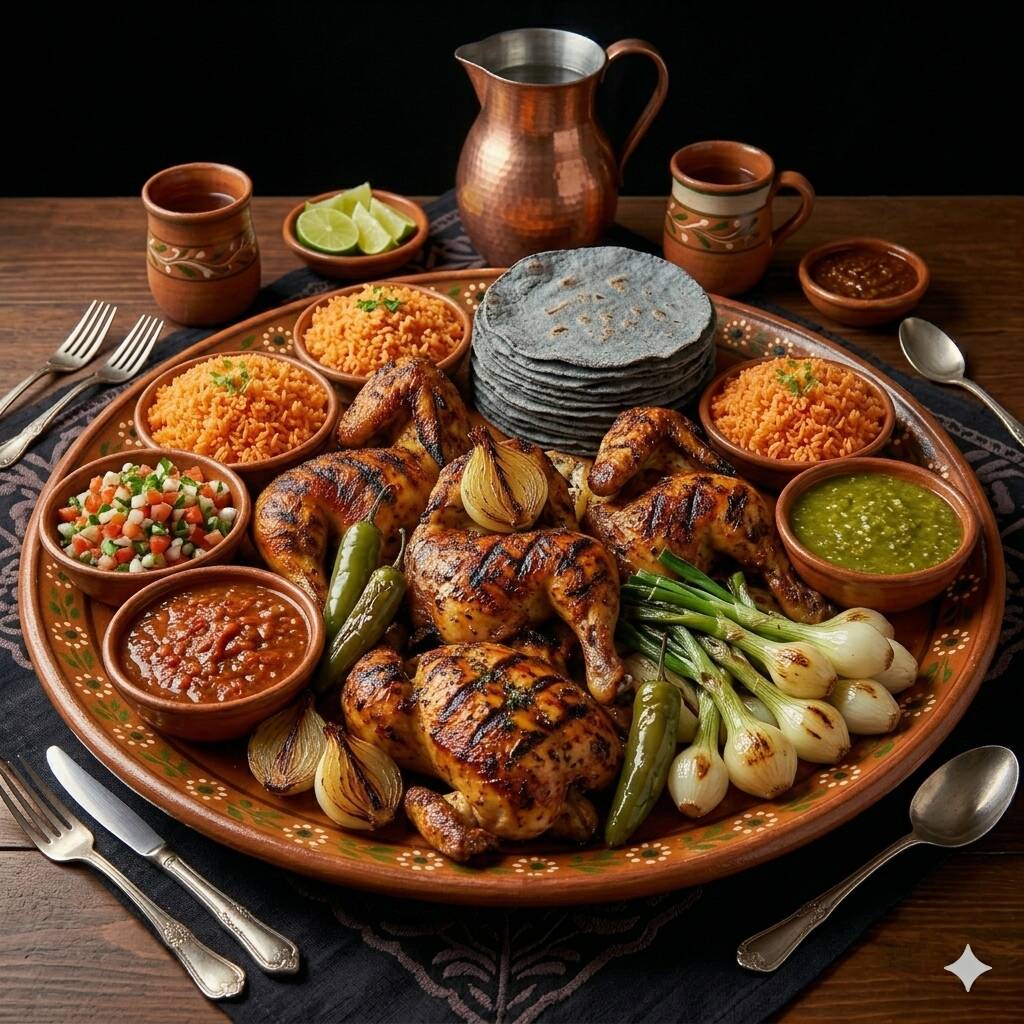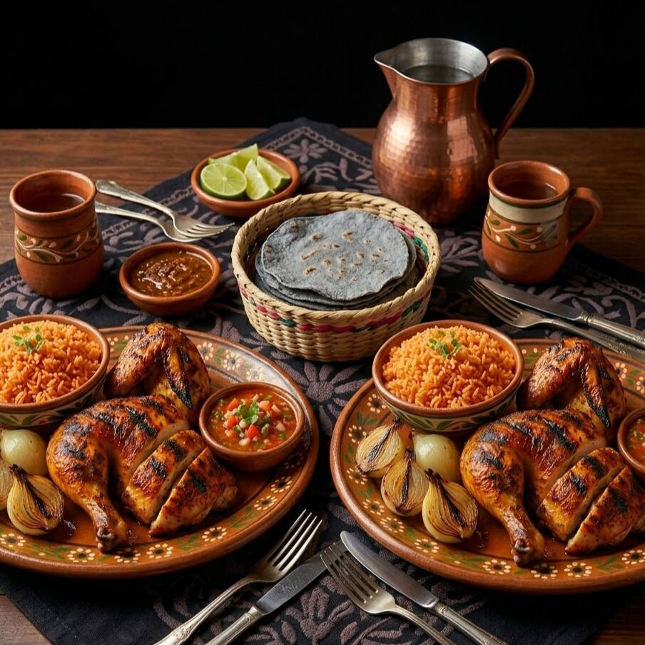 Delicioso pollo Asado para 2 personas, incluye sopa, 2 salsas, cebolla asada y tortilla