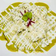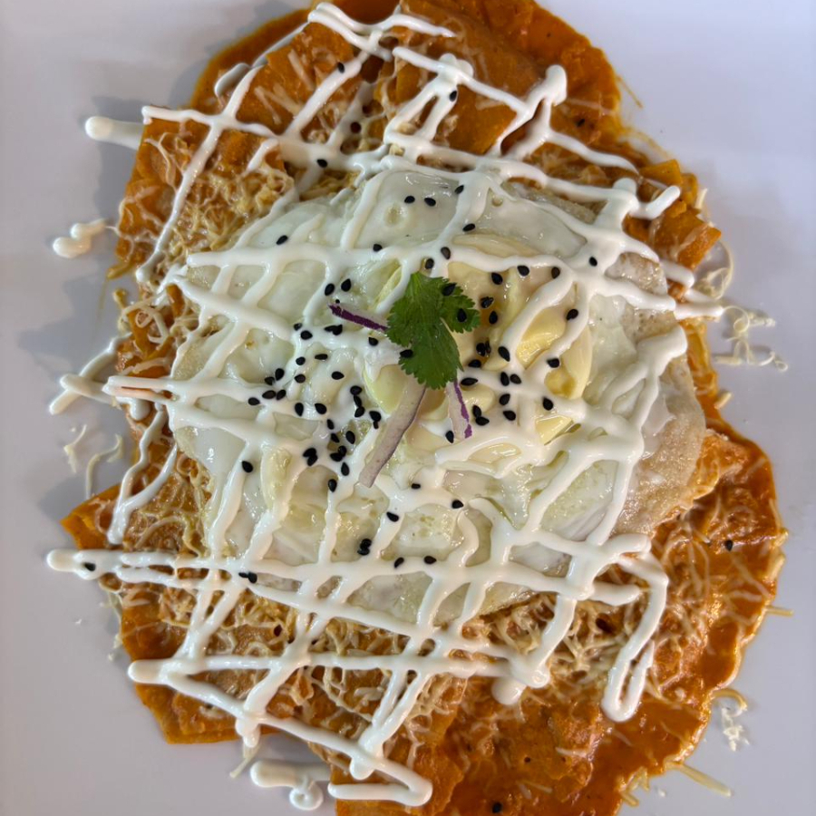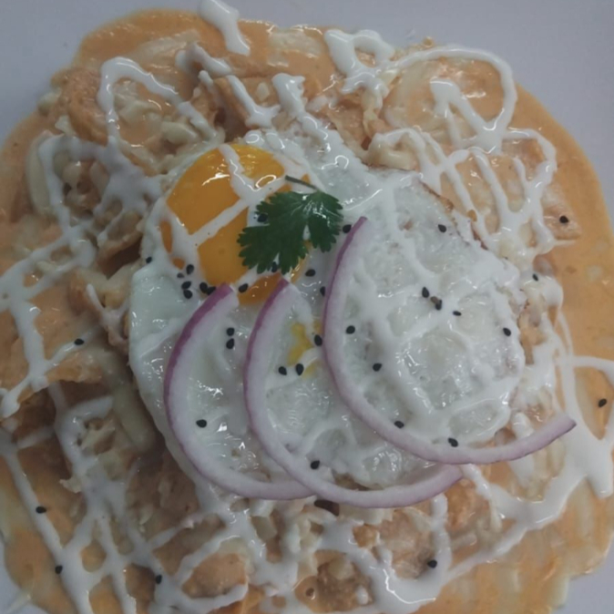 Deliciosos chilaquiles en salsa cremosa de chile habanero montados sobre una cama de frijoles refritos acompañados de 2 huevos estrellados.