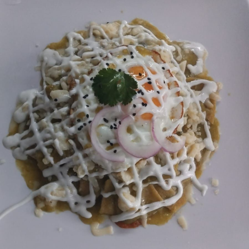 Deliciosos chilaquiles en salsa cremosa de chile poblano acompañados de 2 huevos estrellados.