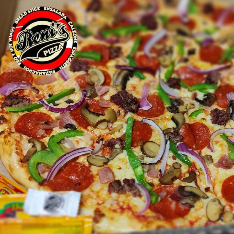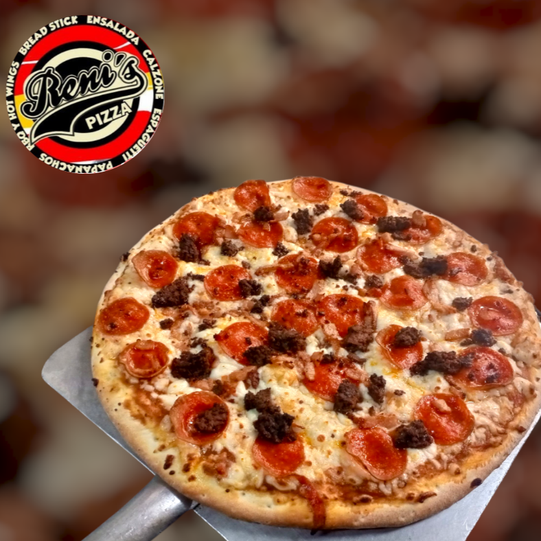 Pizza grande peperoni, carne, tocino, champiñon, morron y cebolla