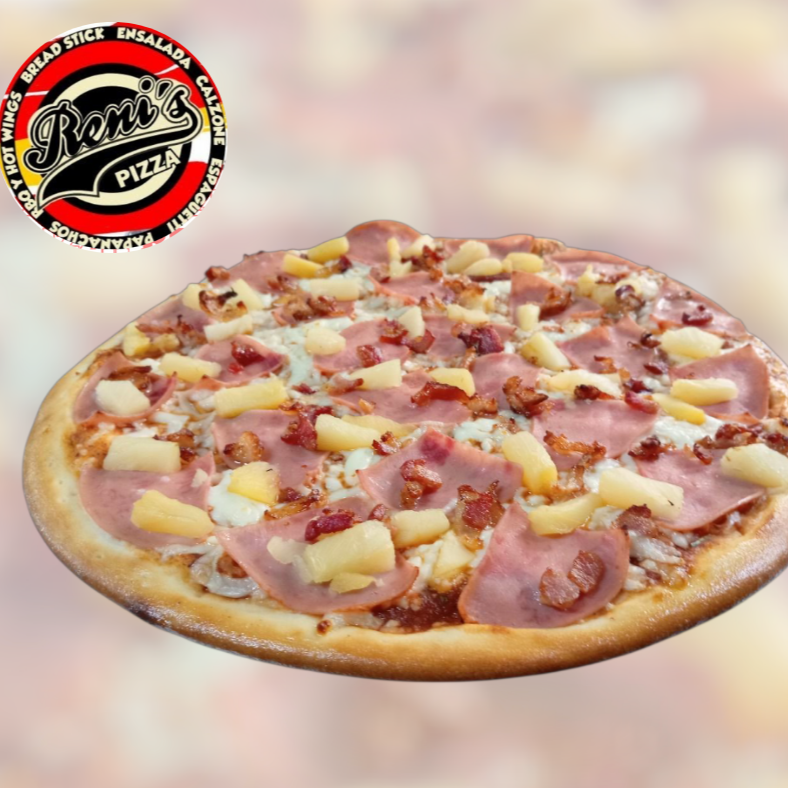 Pizza grande peperoni, mitad jamon, chorizo, tocino y mitad jamon, piña