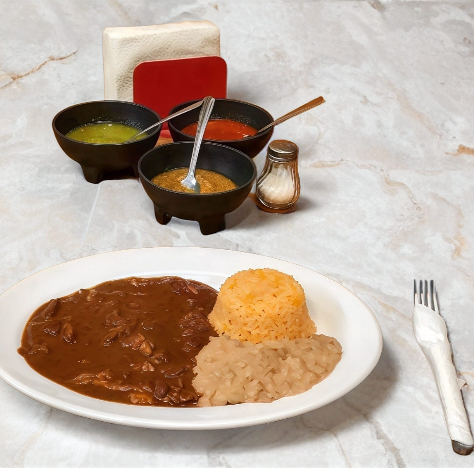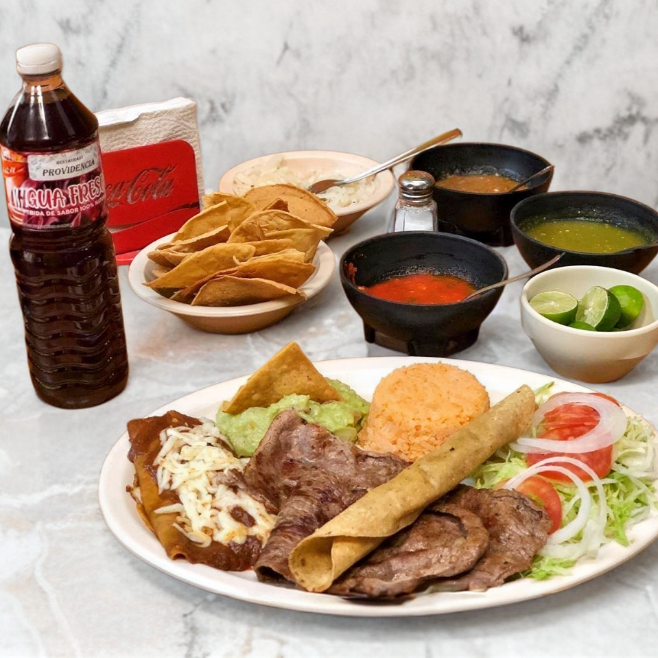 Bistec a la plancha, 2 enmoladas, 1 flauta, frijoles refritos y guacamole.