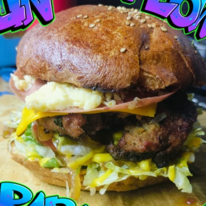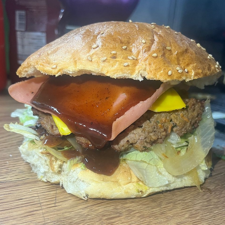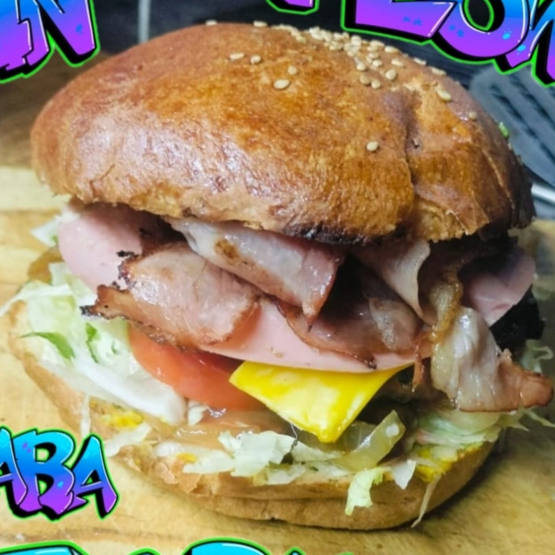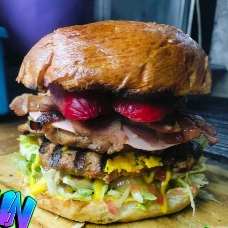 Una de las especialidades de la casa, hamburguesa de doble carne, aguacate, acompañada de salchicha para asar, tocino, queso derretido, cebolla asada, lechuga, tomate, chile,mayonesa,mostaza, catsup, jamón y queso