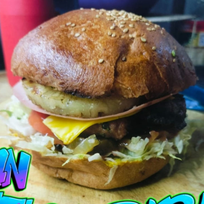 Hamburguesa de res con piña asada, aguacate, lechuga, cebolla asada, tomate, chile queso, jamón y sus aderezos