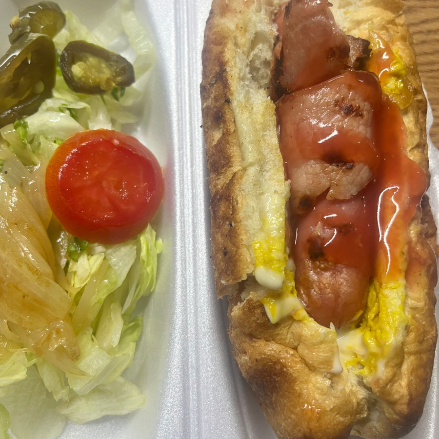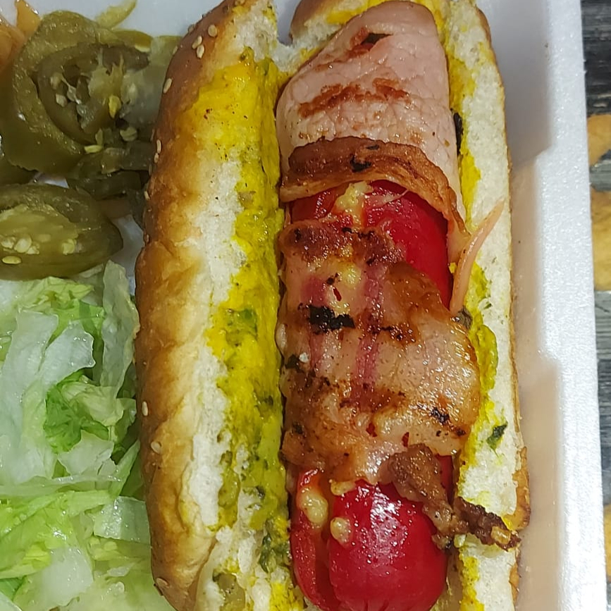 hotdog con salchicha para asar envuelta en tocino, acompañado de su verdura y aderezos