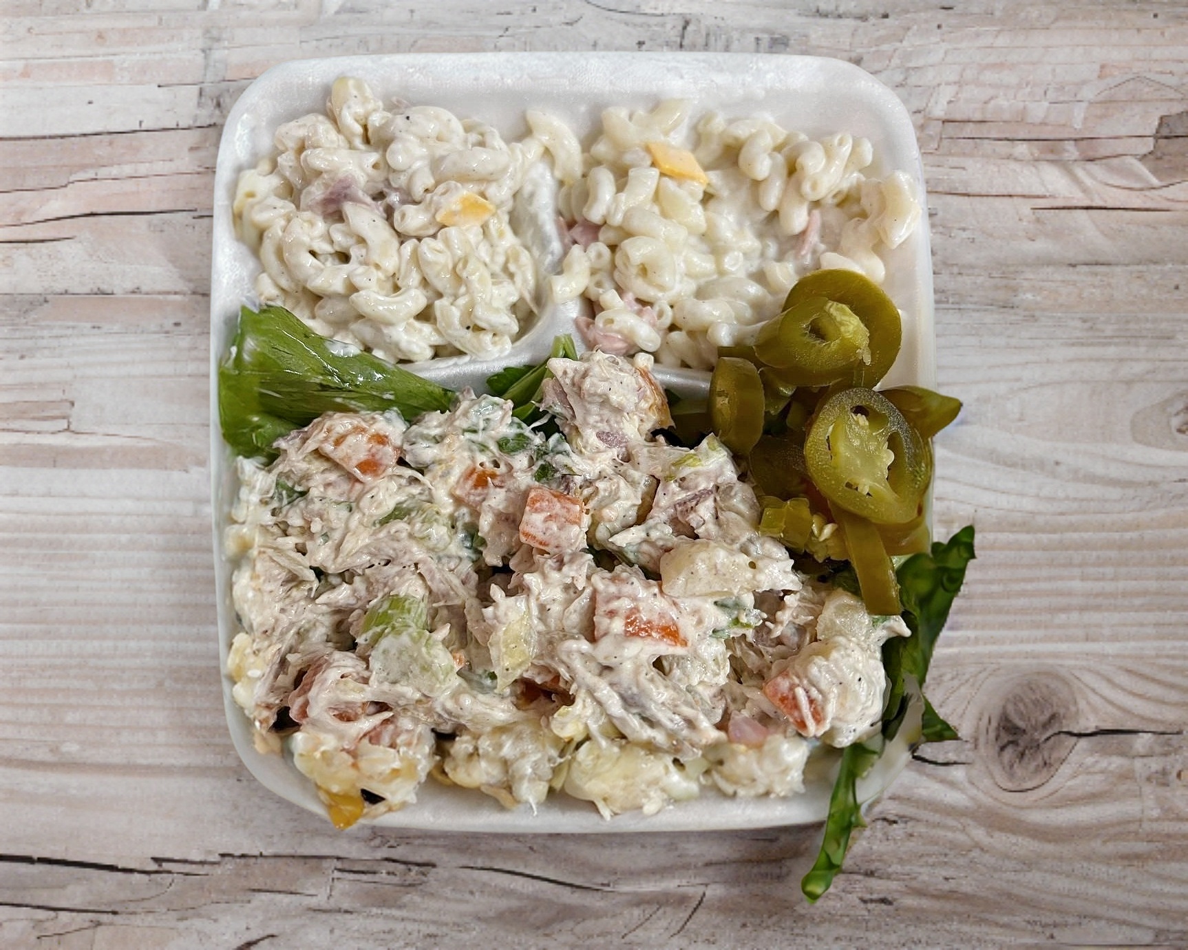 Acompañado con lechuga, queso panela, aguacate, pollo de pechuga y aderezo.