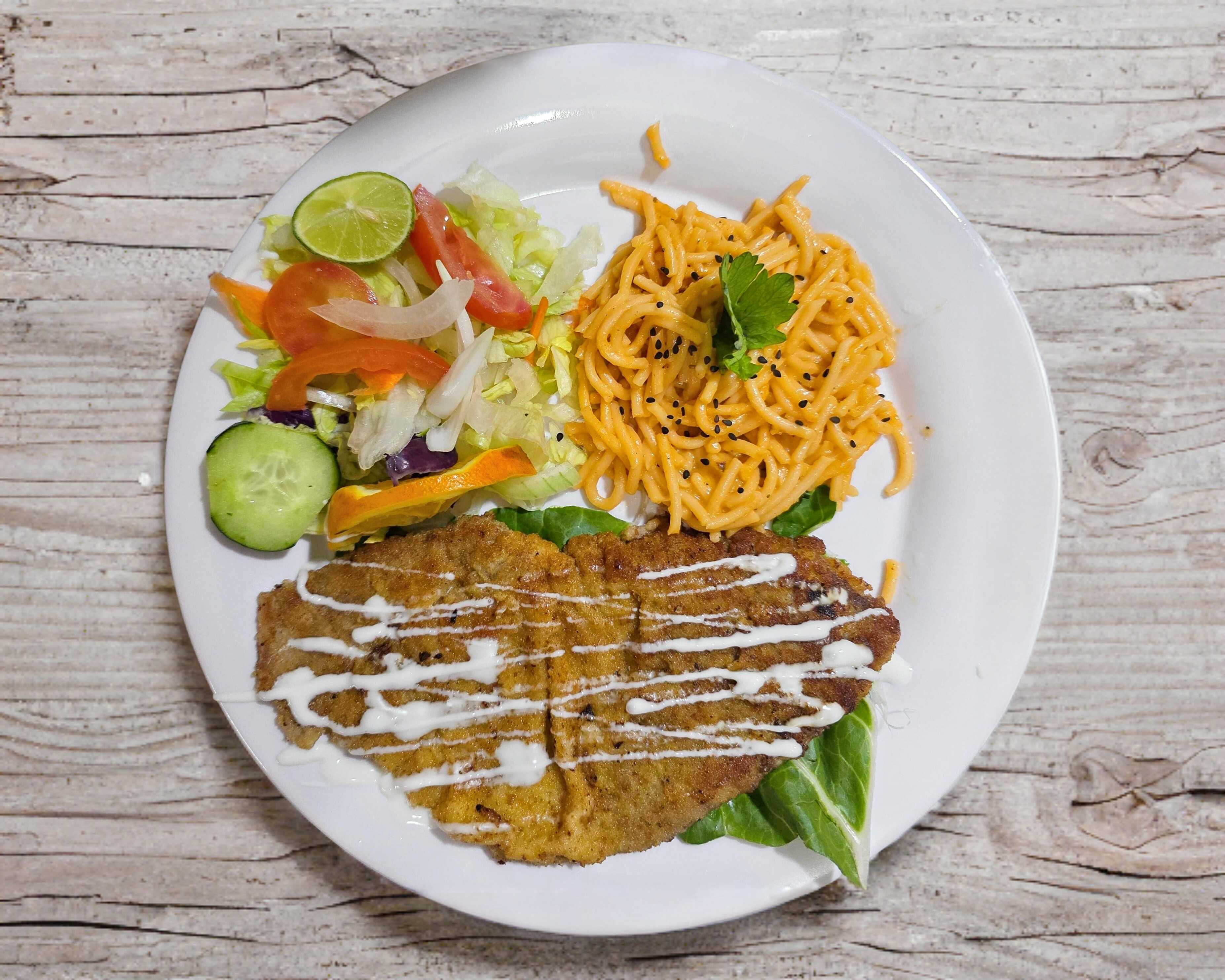 Acompañada con arroz o espagueti, aparte lleva ensalada, tortillas y salsa.