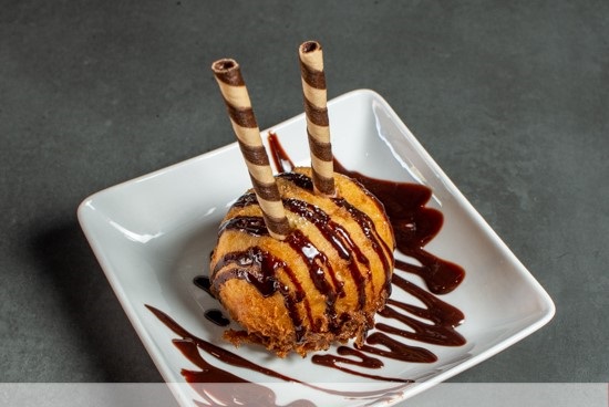 Exquisita bola de helado frita, acompañada de galleta y bañada en salsa dulce a elección (210 grms)