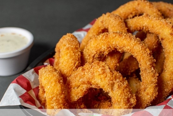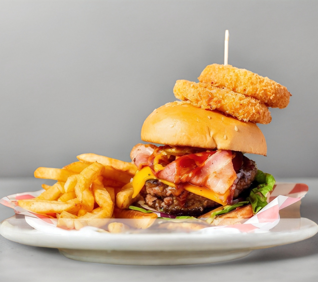 Exquisita hamburguesa con tocino, queso amarillo, salsa bbq y aros de cebolla acompañada de papas a la francesa (450 grms)