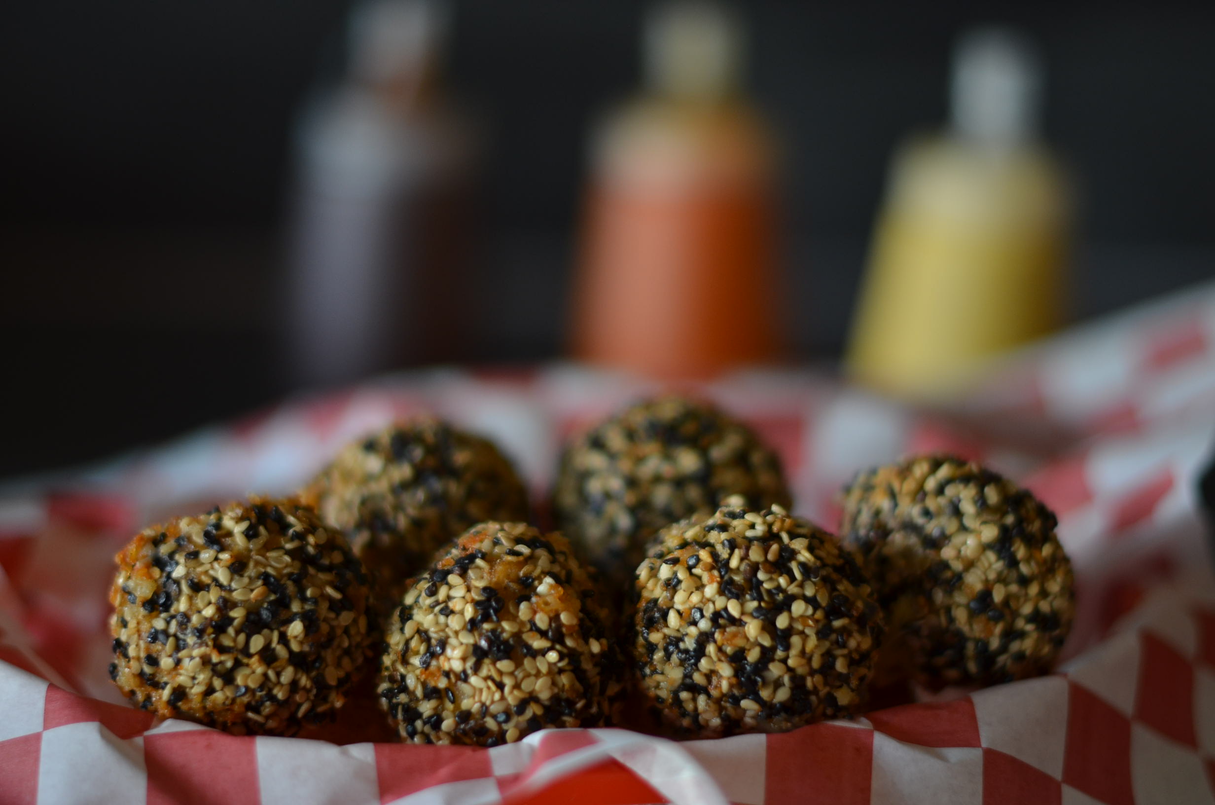 230 gramos, 6 piezas, Bolas de Queso fritas y empanizadas con ajonjoli natural y negro
