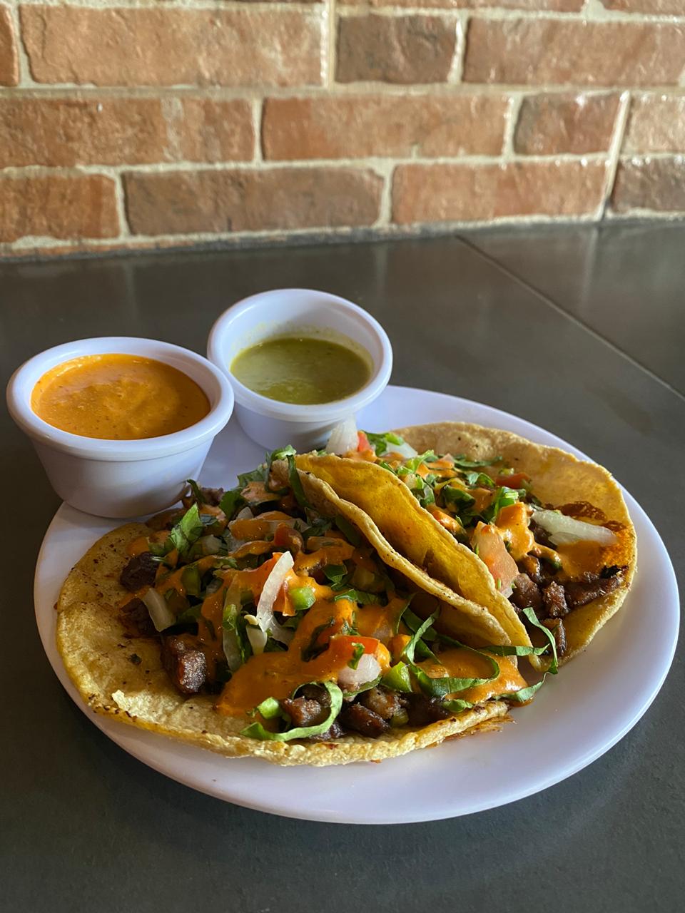 Tortillade maíz o Harina rellena de suave fajita de res, acompañada de pico de gallo y salsa