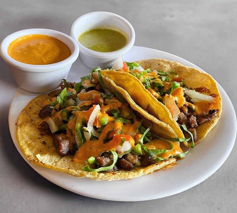 Tortillade maíz o Harina rellena de suave fajita de res con queso, acompañada de pico de gallo y salsa