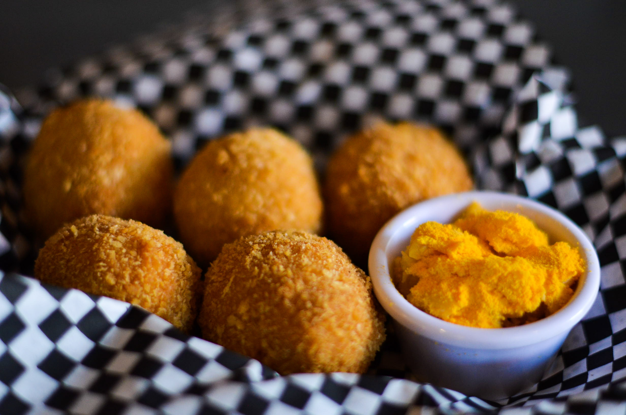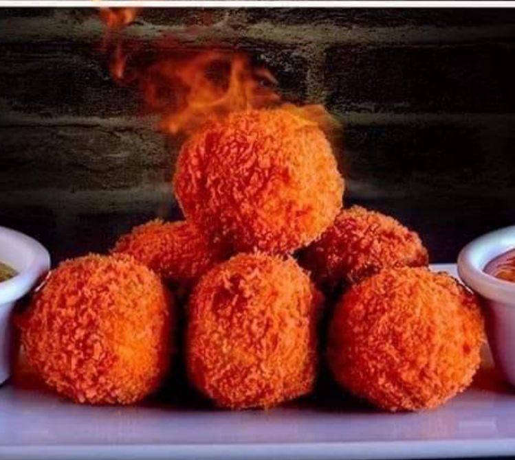 Bolas de queso con tocino y pepperoni acompañadas con salsa de tomate