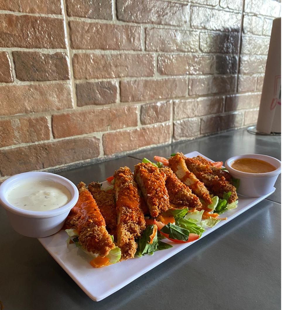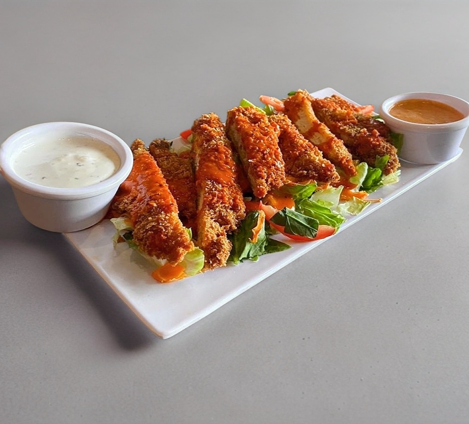 Tiras de pollo empanizadas servidas en una cama de ensalada