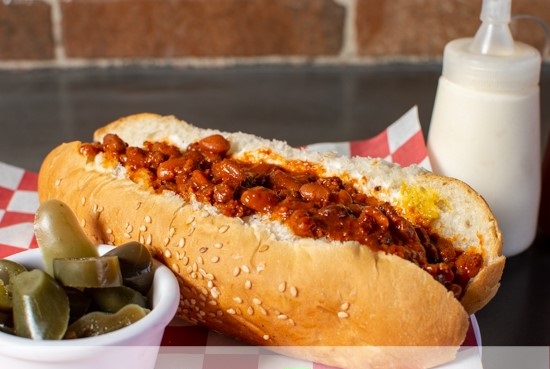 Exquisito hot dog con salchicha marinada con salsa ritual empanizada y bañada en chili dog (130 grms)