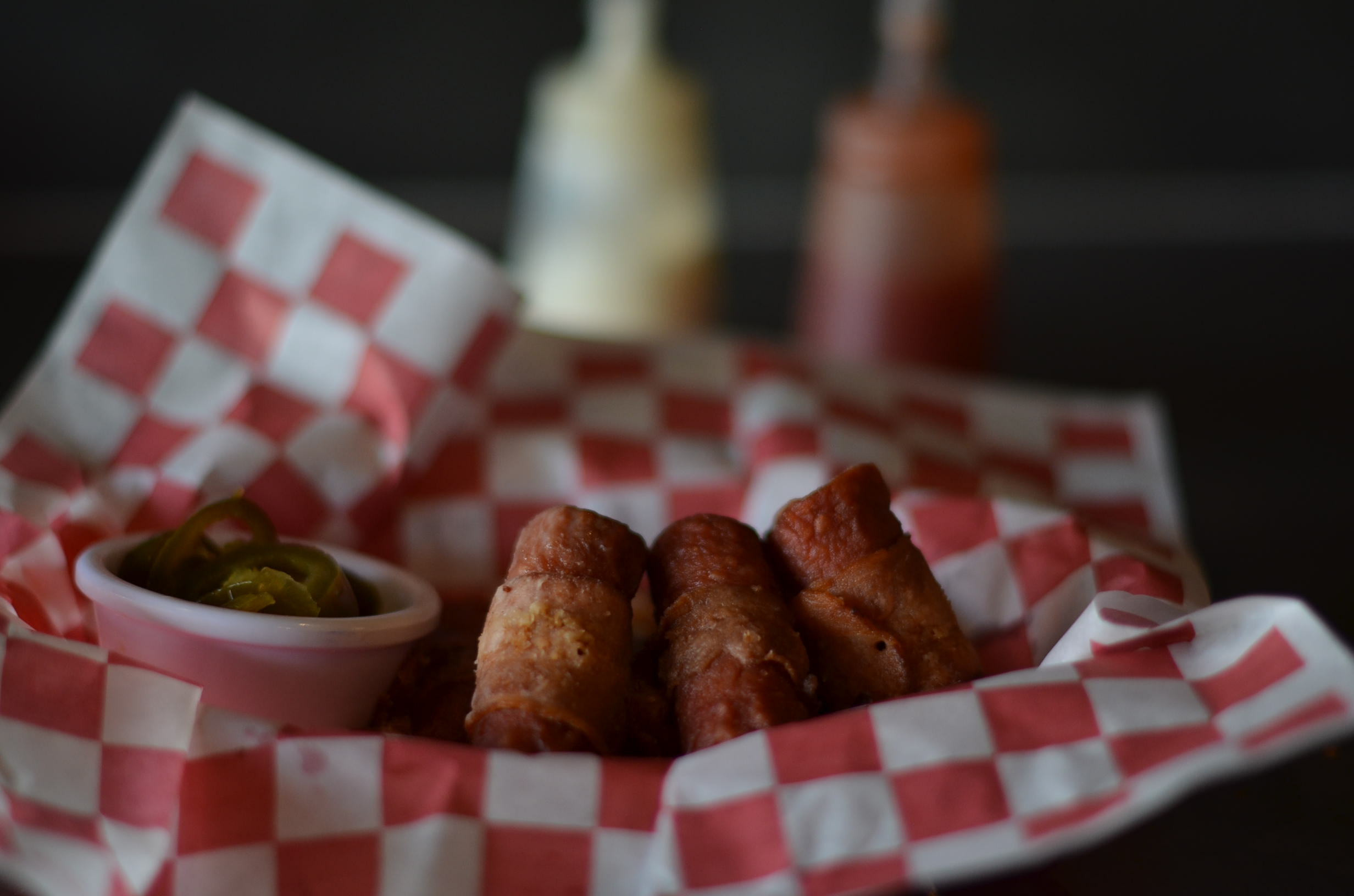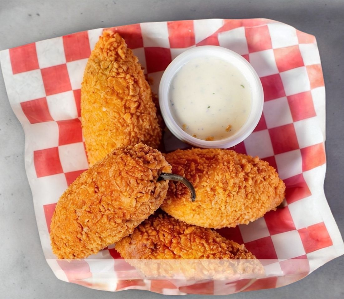 380 gramos, 4 piezas, Chiles jalapeños rellenos de queso crema, carne, envueltos en tocino y empanizados