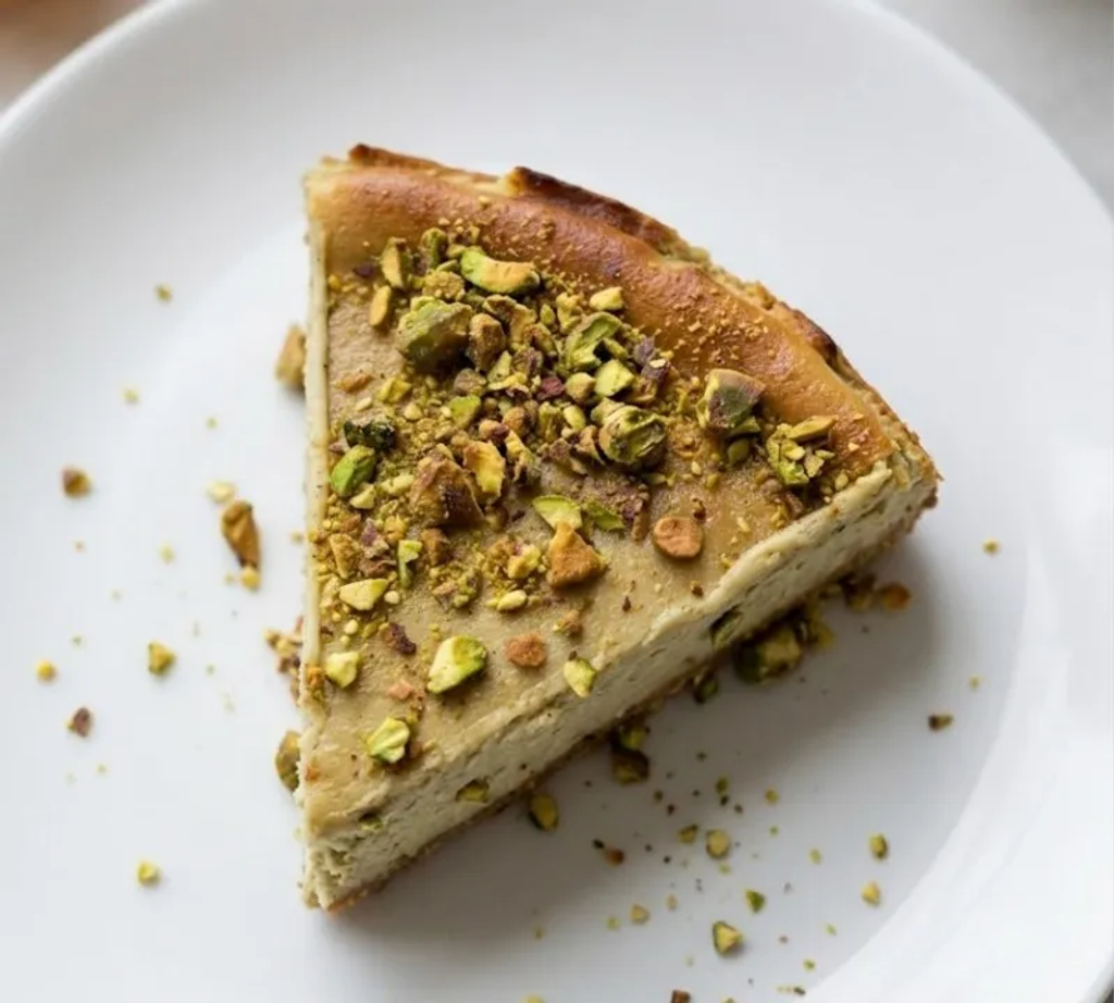 Tarta horneada de pistache, elaborada con 2 quesos, base de galleta y pistache triturado.