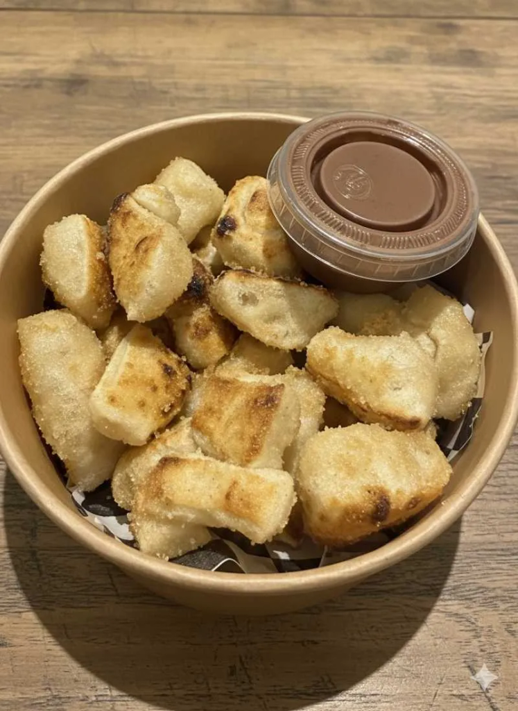 Bites de pan espolvoreados con azúcar y canela, acompañados de crema de avellana.