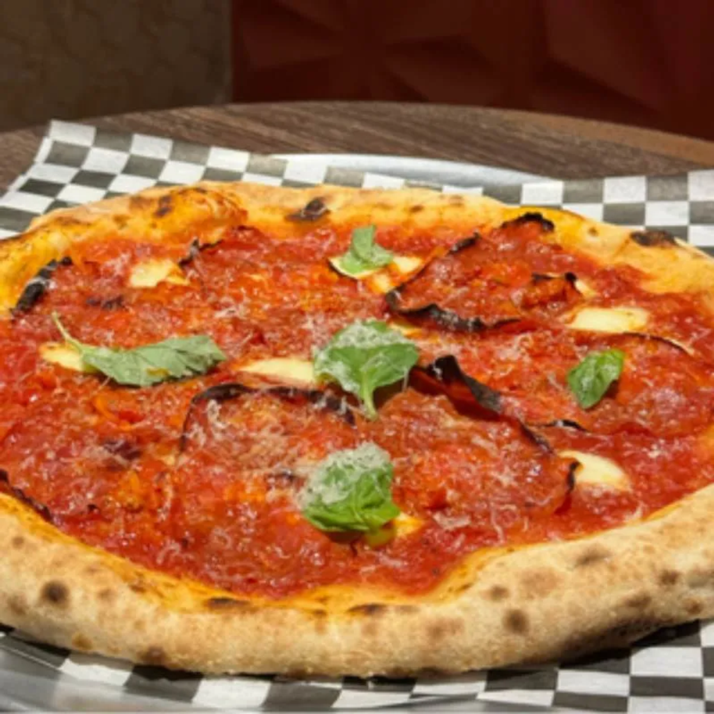 Base de salsa pomodoro, mozzarella fresco, salame calabrese importado, pasta de chile calabrese, parmesano reggianito, coronado con albahaca fresca.