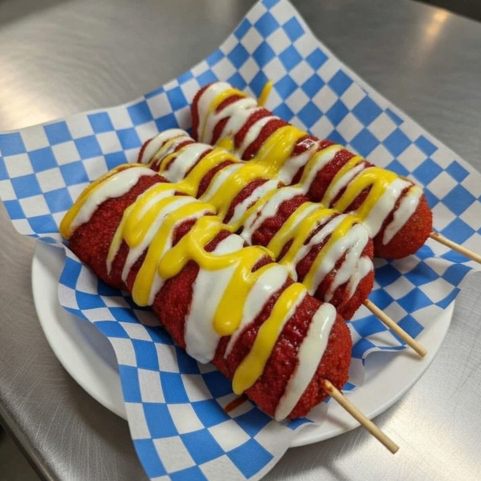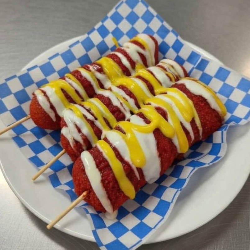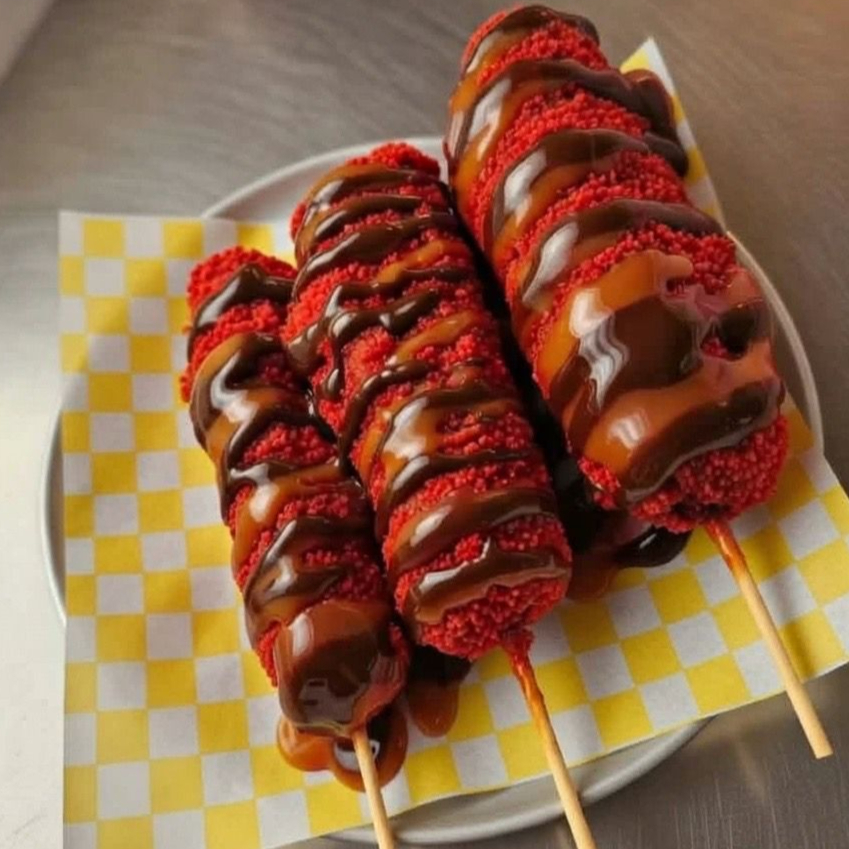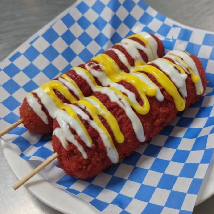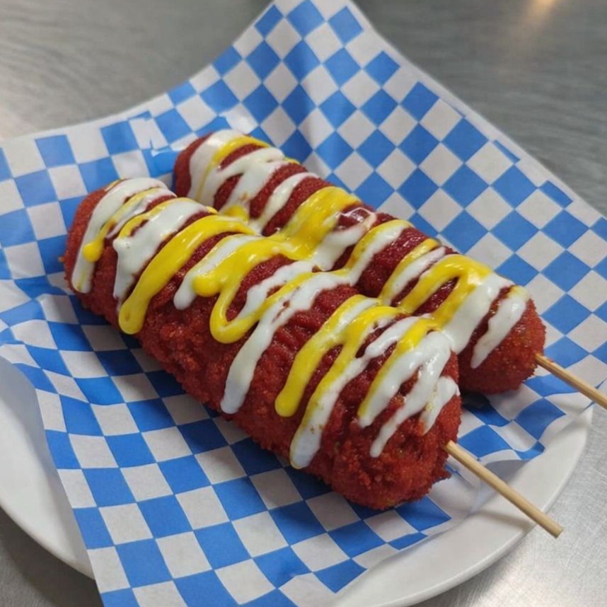 ORDEN DE 3 BANDERILLAS COREANA ENCHILADA CON POLVO ESTILO TAKIS FUEGO. CRUJIENTE POR FUERA SUAVE POR DENTRO. NO INCLUYE ADEREZOS, FAVOR DE ESCOGERLOS A PARTE.