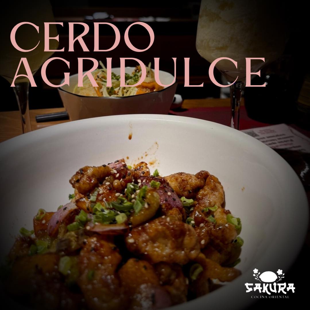 Cerdo en salsa agridulce, pimientos, cebolla, piña y ajonjolí.
