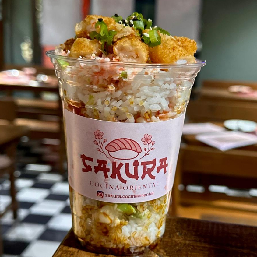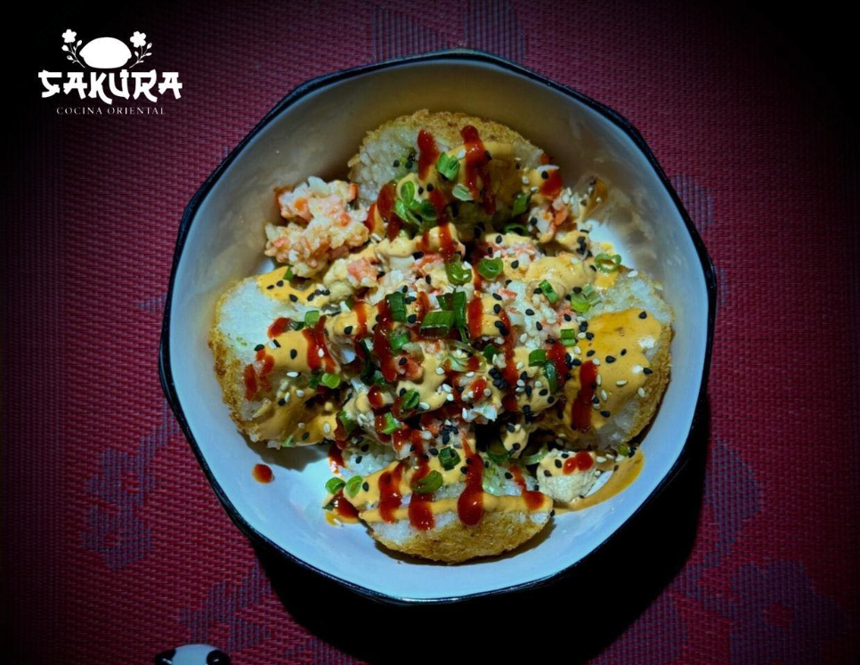 Crujientes bolas de arroz empanizadas con base de aguacate, queso crema, tampico y pepino bañadas en mayo spicy.