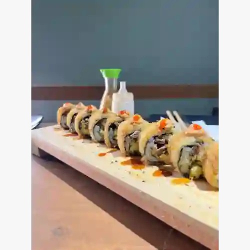 Rollo empanizado, aguacate, queso crema, carne. pf queso gratinado, mayo spicy y salsa de anguila.