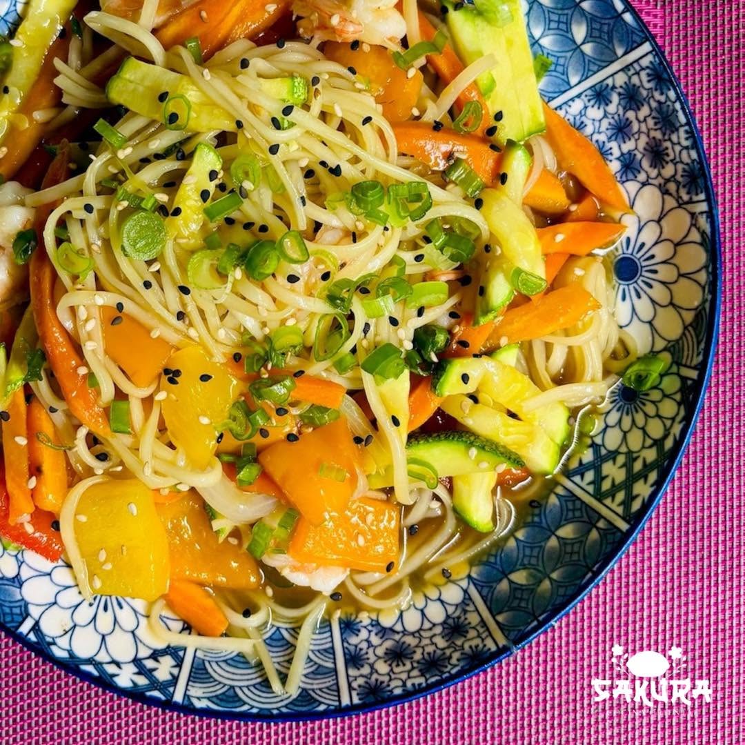 Fondo de camaron y especias orientales, camarones y cebollin, acompañado de verduras tempura y un toque de chile japones.