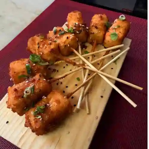 Rollitos de surimi empanizados, rellenos de queso crema y acompañados de una salsa spicy.