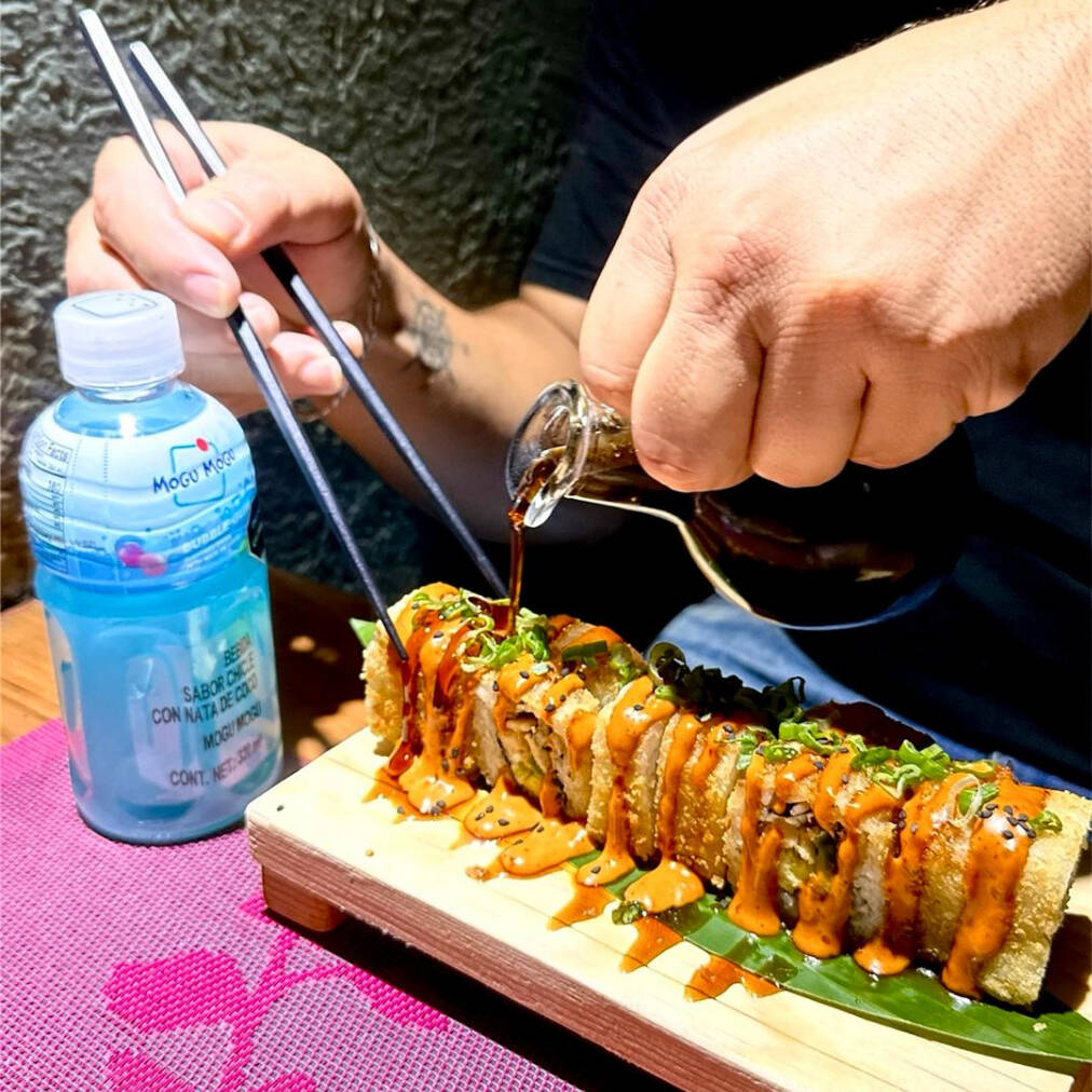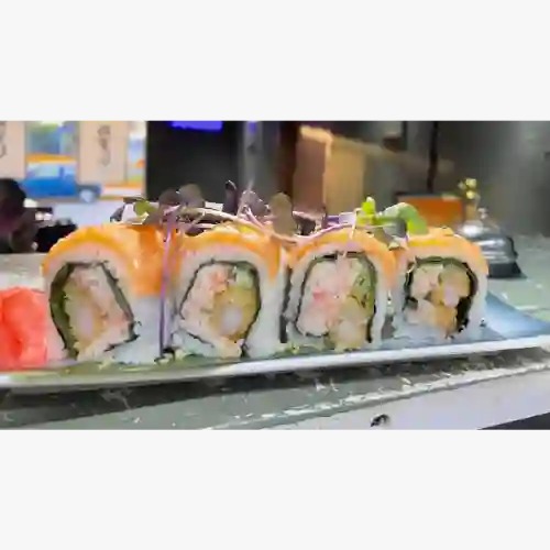 Camarón tempura, aguacate, pepino y mayo spicy, por fuera pulpo, cebollín, aceite de ajonjolí, masago y salsa anguila.
