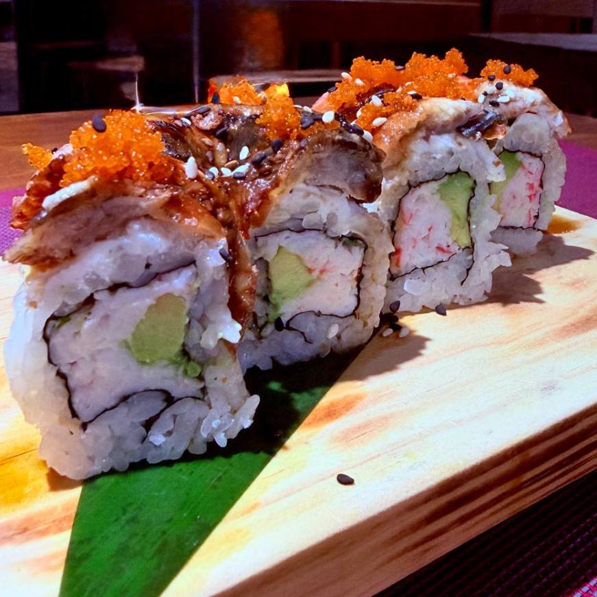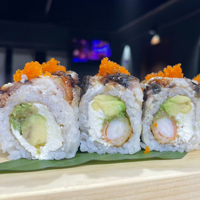 Camarón, queso crema, aguacate y pepino. por fuera anguila, ajonjolí, cebollín, masago y salsa anguila.