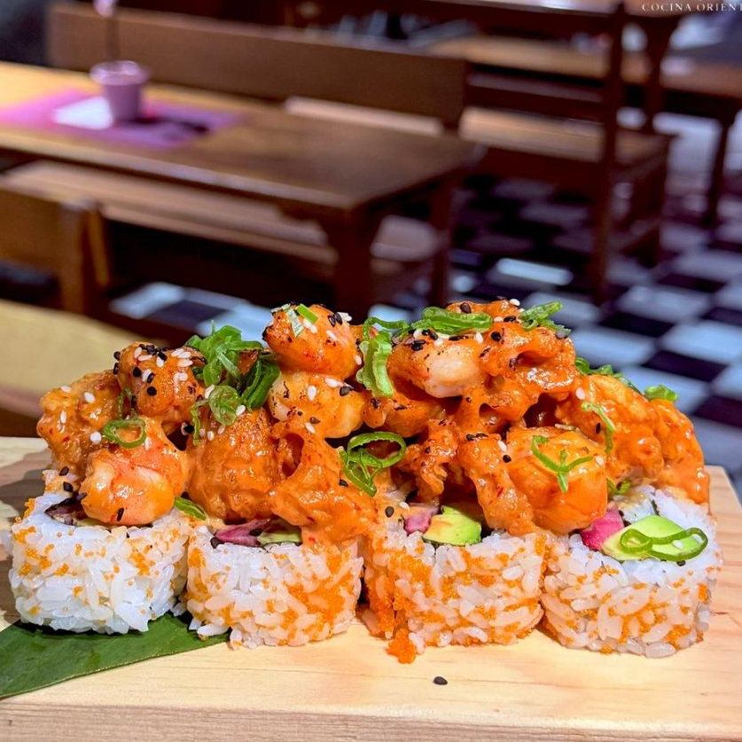 Camarones en tempura, bañados en mayo spicy, togarashi, coronado con masago y cebollín.