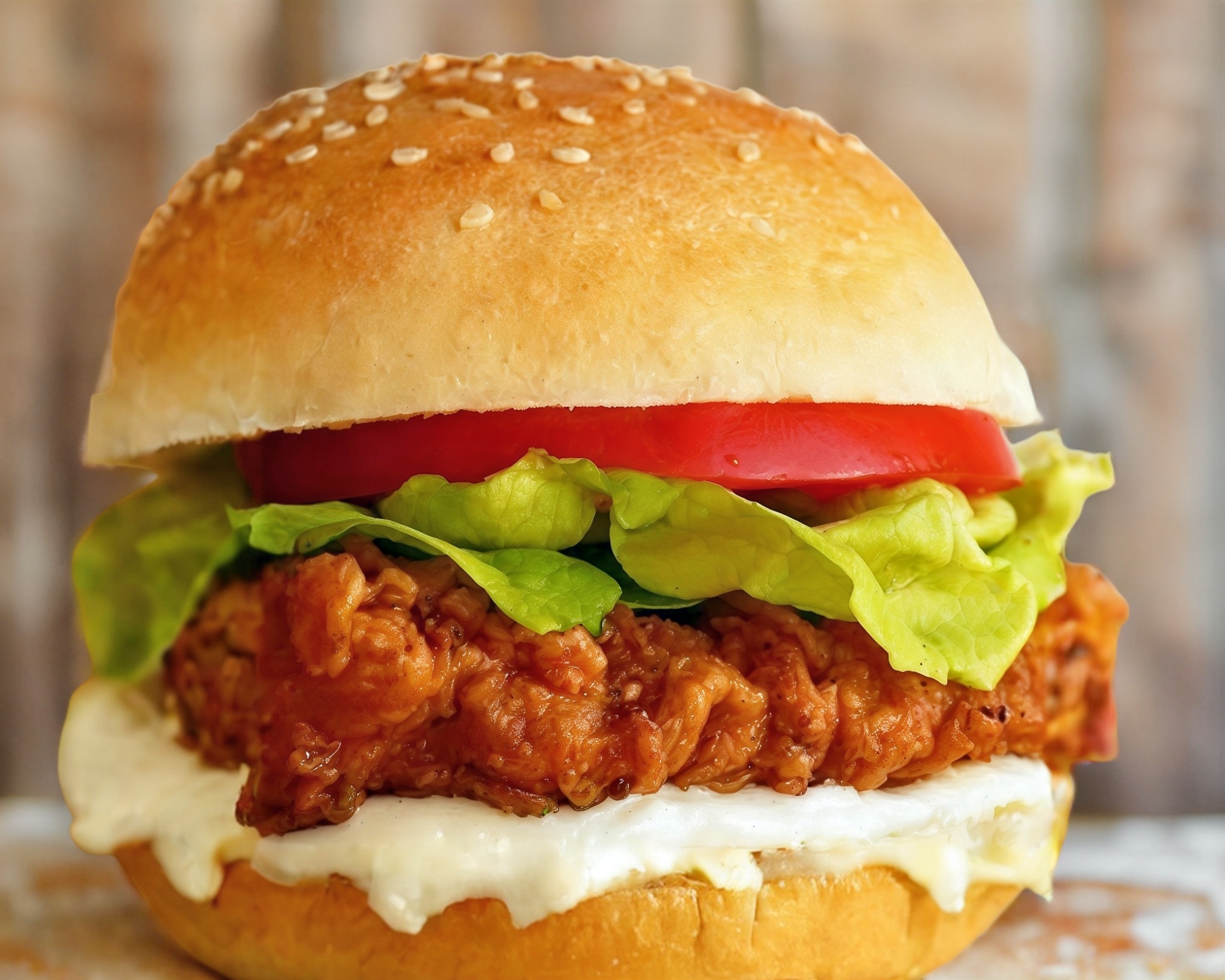 Hamburgeza de pollo, acompañada de verdura, tomate, cebolla lechuga con aderezos de catsup, mostaza y mayonesa