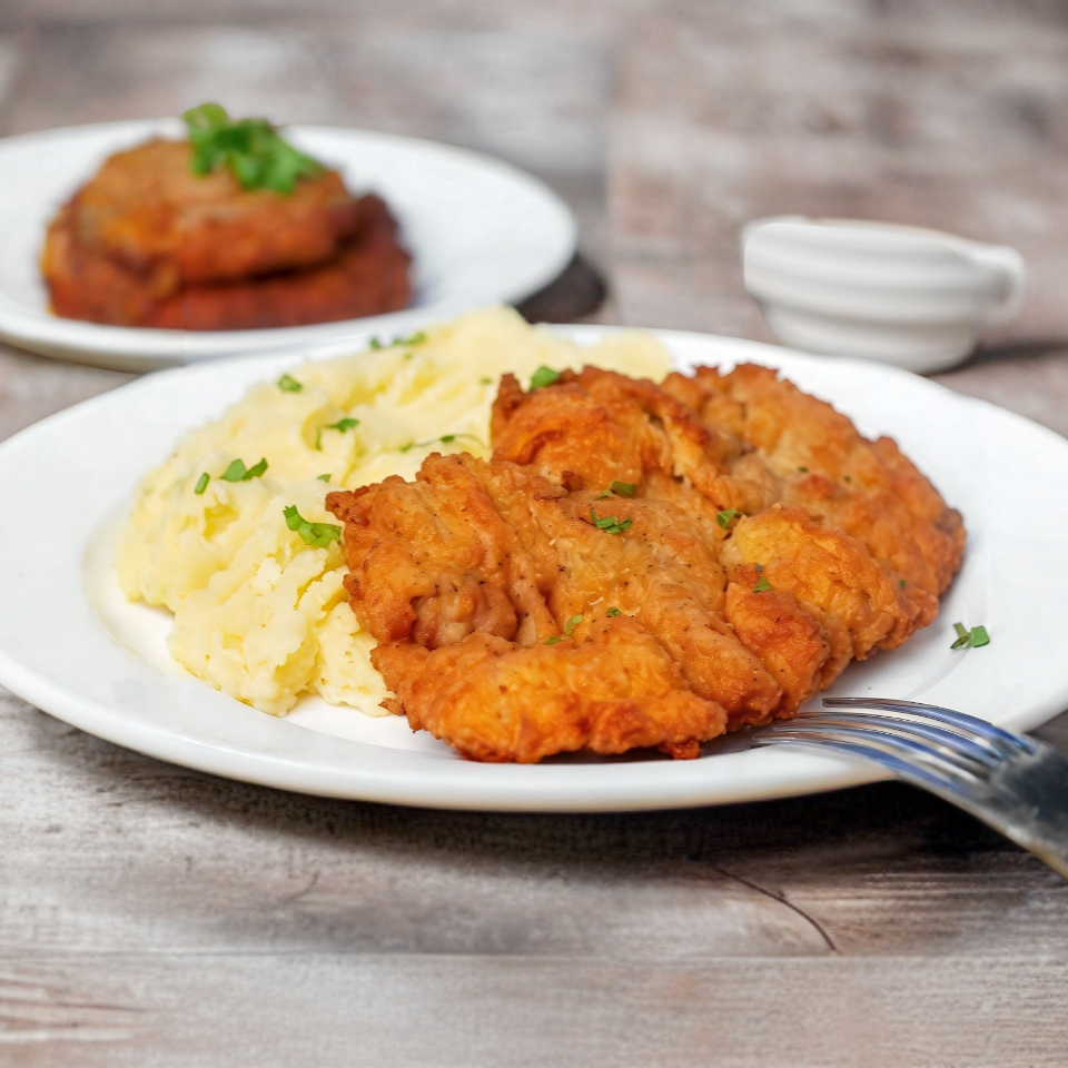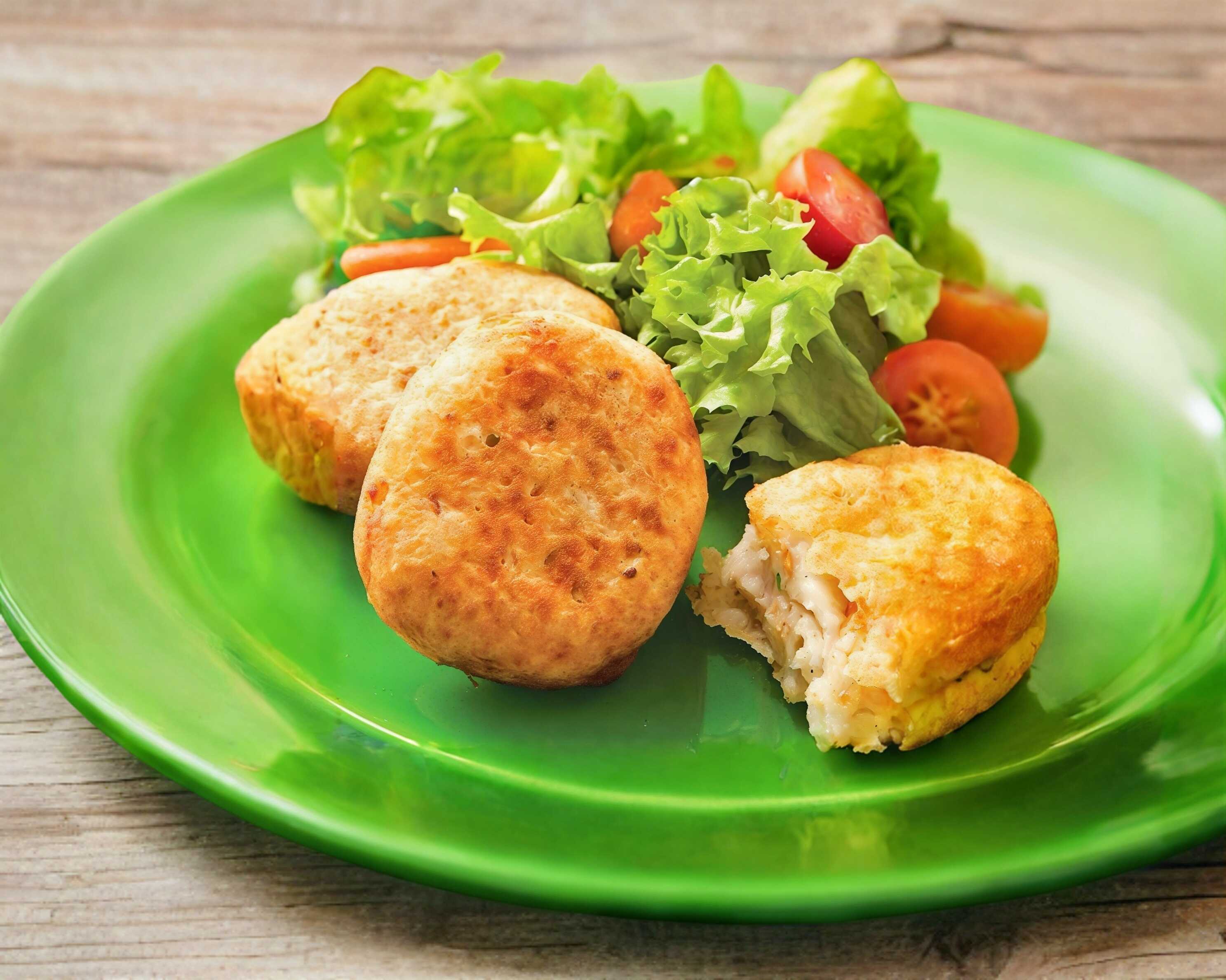 Croquetas de papa, con mantequilla y queso, empanizadas, acomp0añadas de arroz y ensalada. 4 piezas.