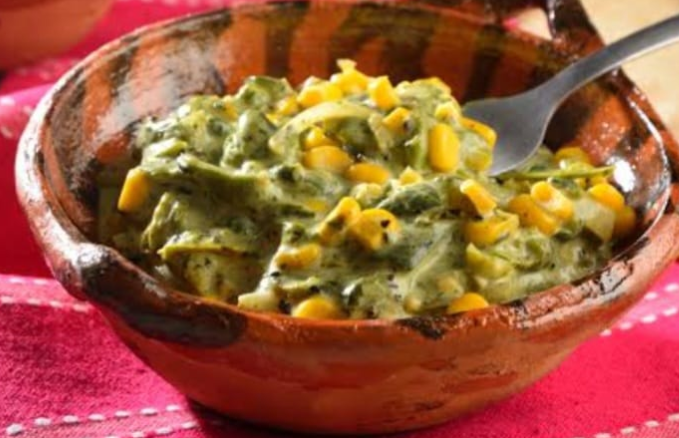 Rajas de chile poblano con elote amarillo y queso. porción de medio litro.