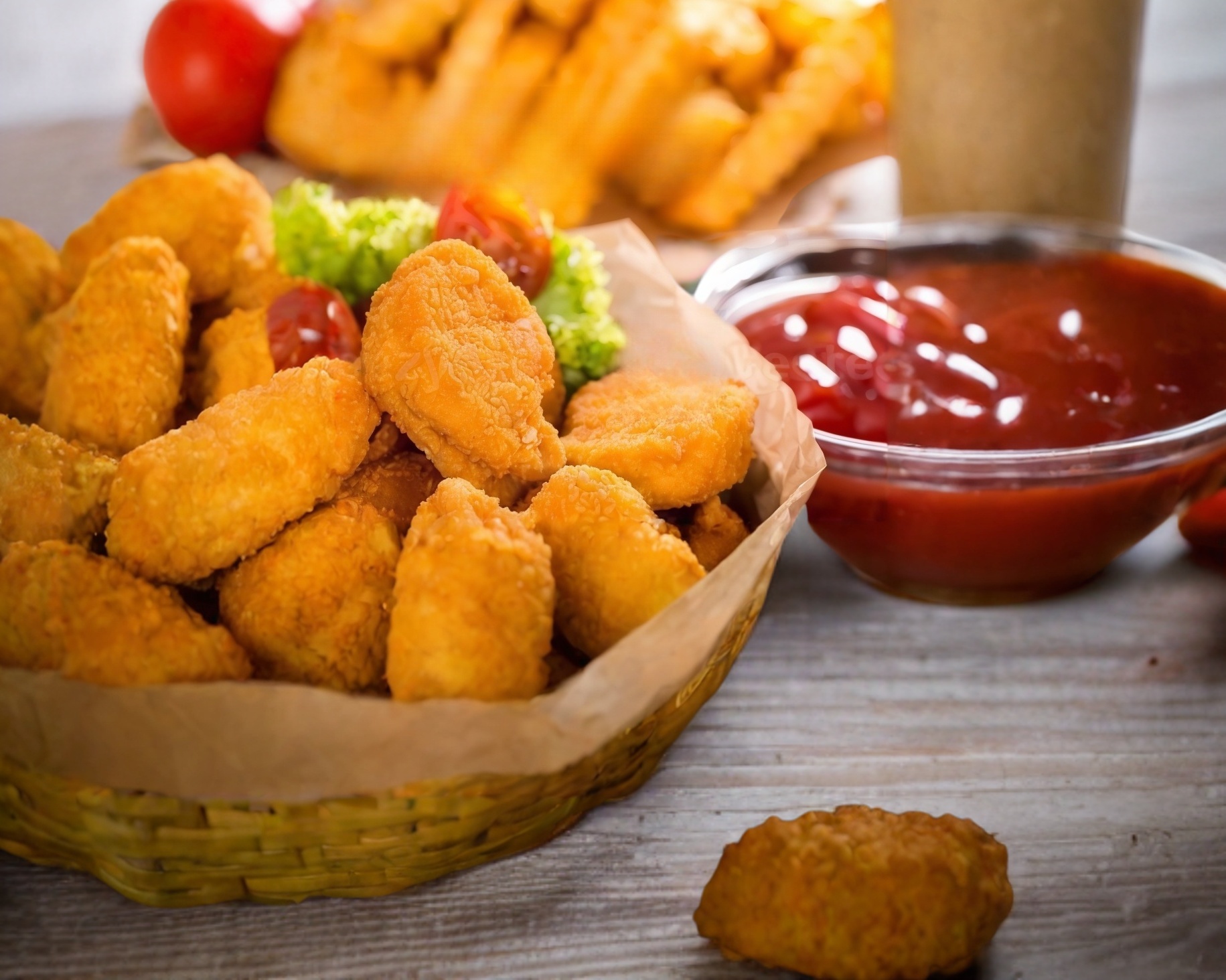 Nutguets de pollo acompañados de papas a la francesa. 6 pzas de nuguet y 100 grs de papas a la francesa. Acompañados de salsa catsup.