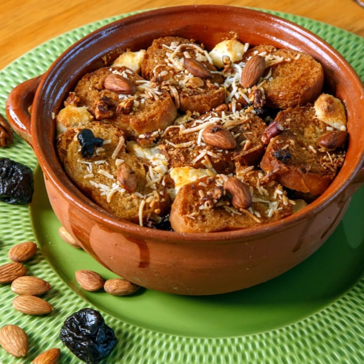 Bolillo tostado bañado en ´piloncillo, acompañado de queso, coco, cacahuate, pasas y granillo