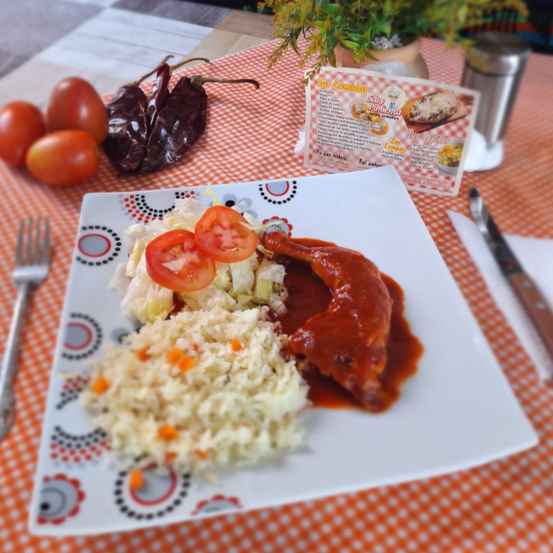 Pieza de pollo bañado en pipian acompañado de arroz y ensalada