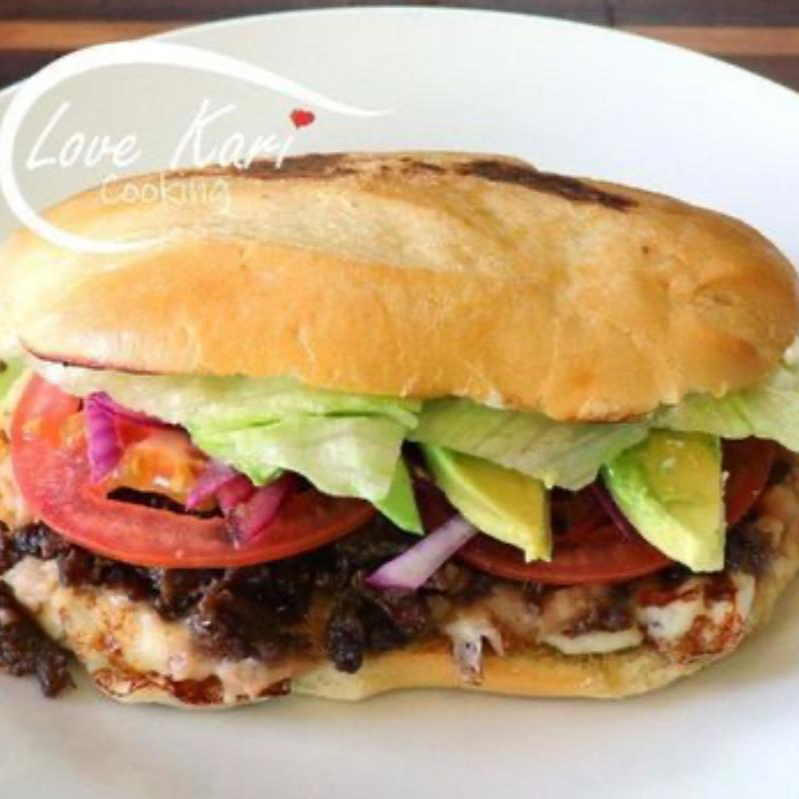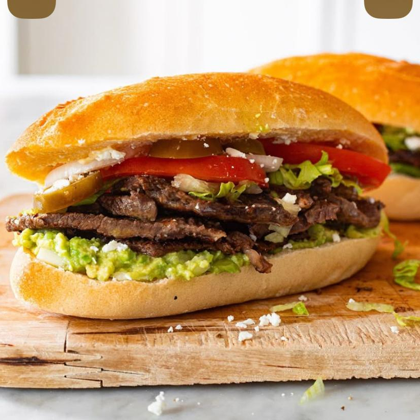 Lonche de carne de puerco, acompañado de aguacate, queso blanco, tomate, cebolla, repollo y salsa roja casera.