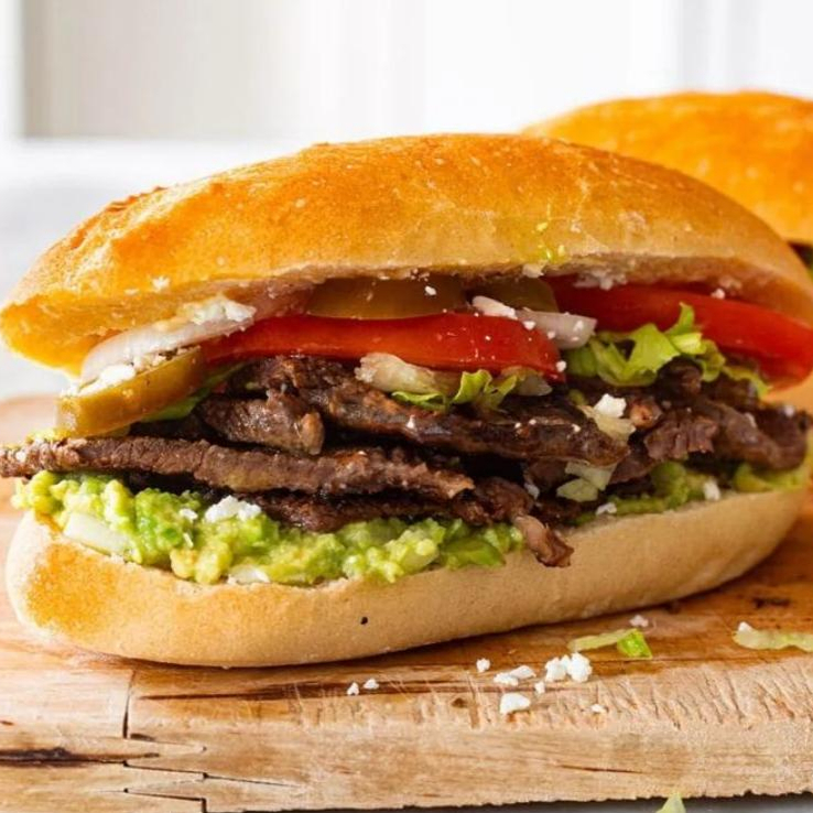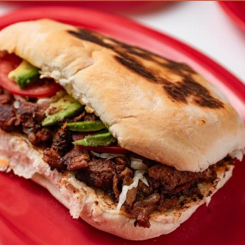 Lonche de adobada, acompañado de aguacate, tomate, cebolla, repollo y salsa roja casera.