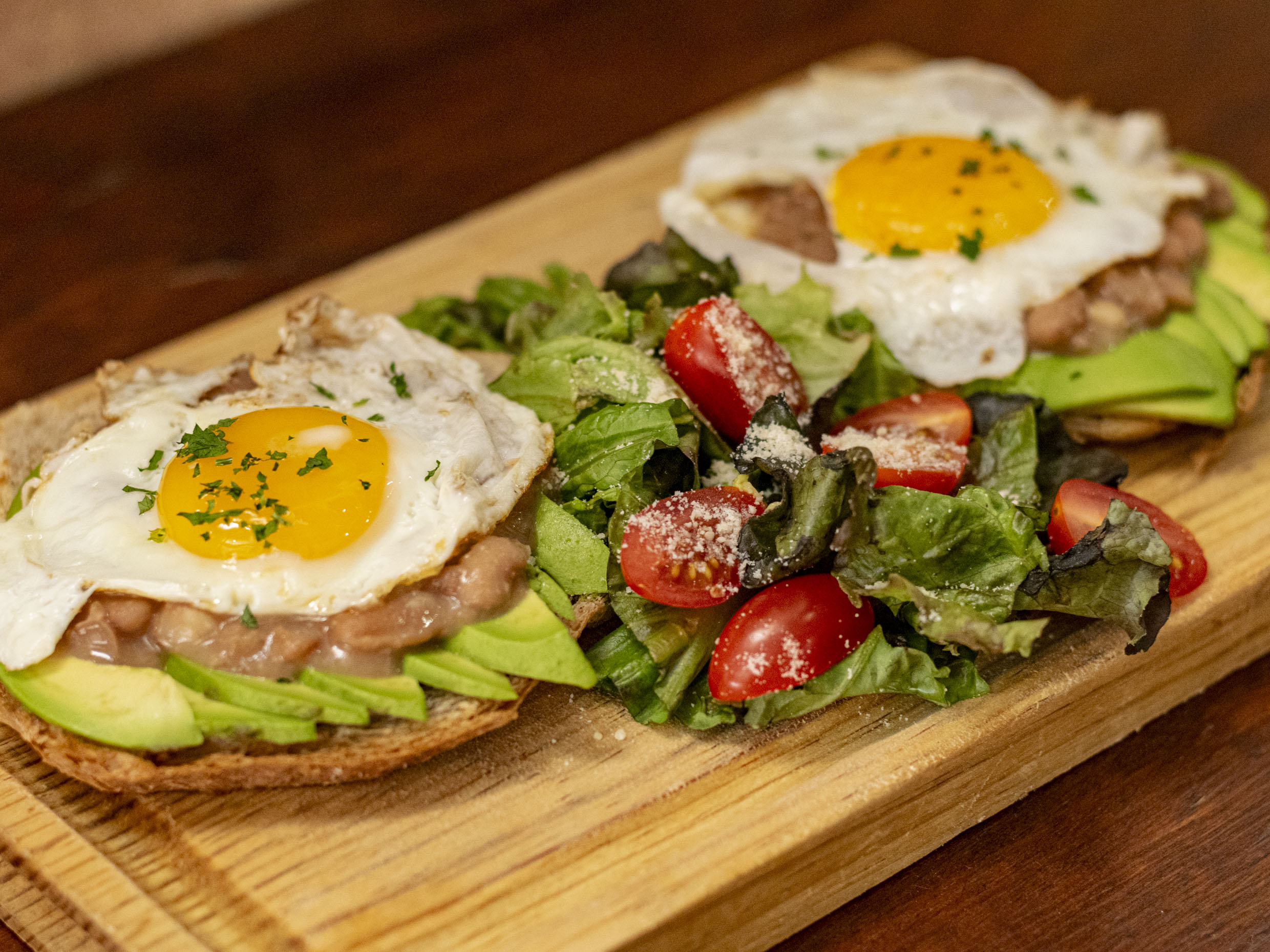 Toasts (dos piezas) pan artesanal, cama de aguacate, frijol de la olla, coronados con huevos estrellados; acompañados con ensalada