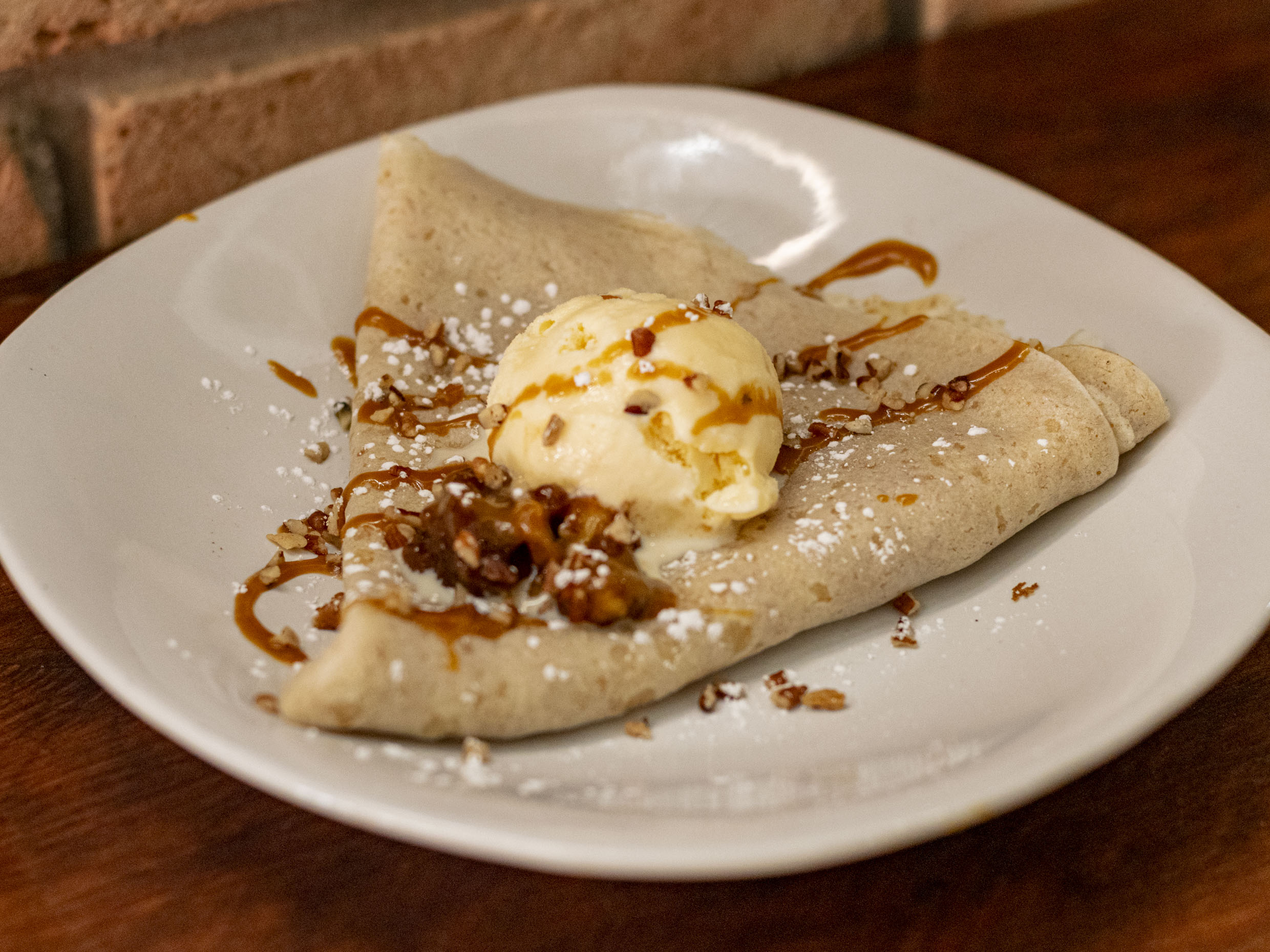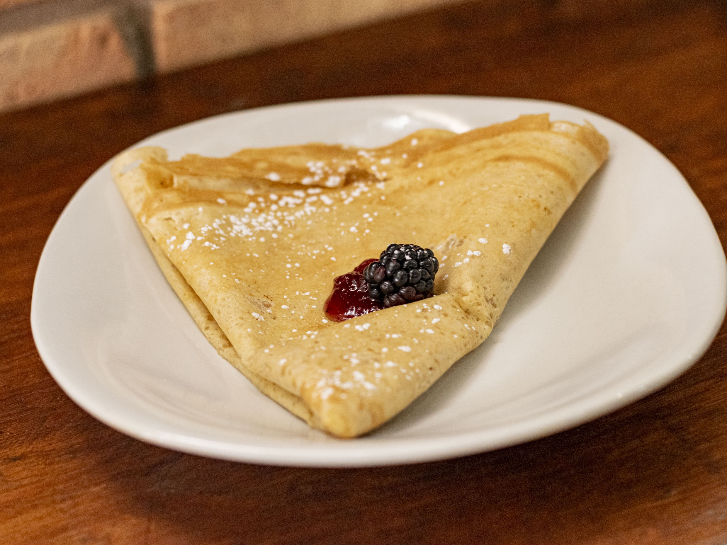 Pancakes a base de avena, quinoa, amaranto y harina integral; topeados con fruta de temporada, amaranto y caramelo
