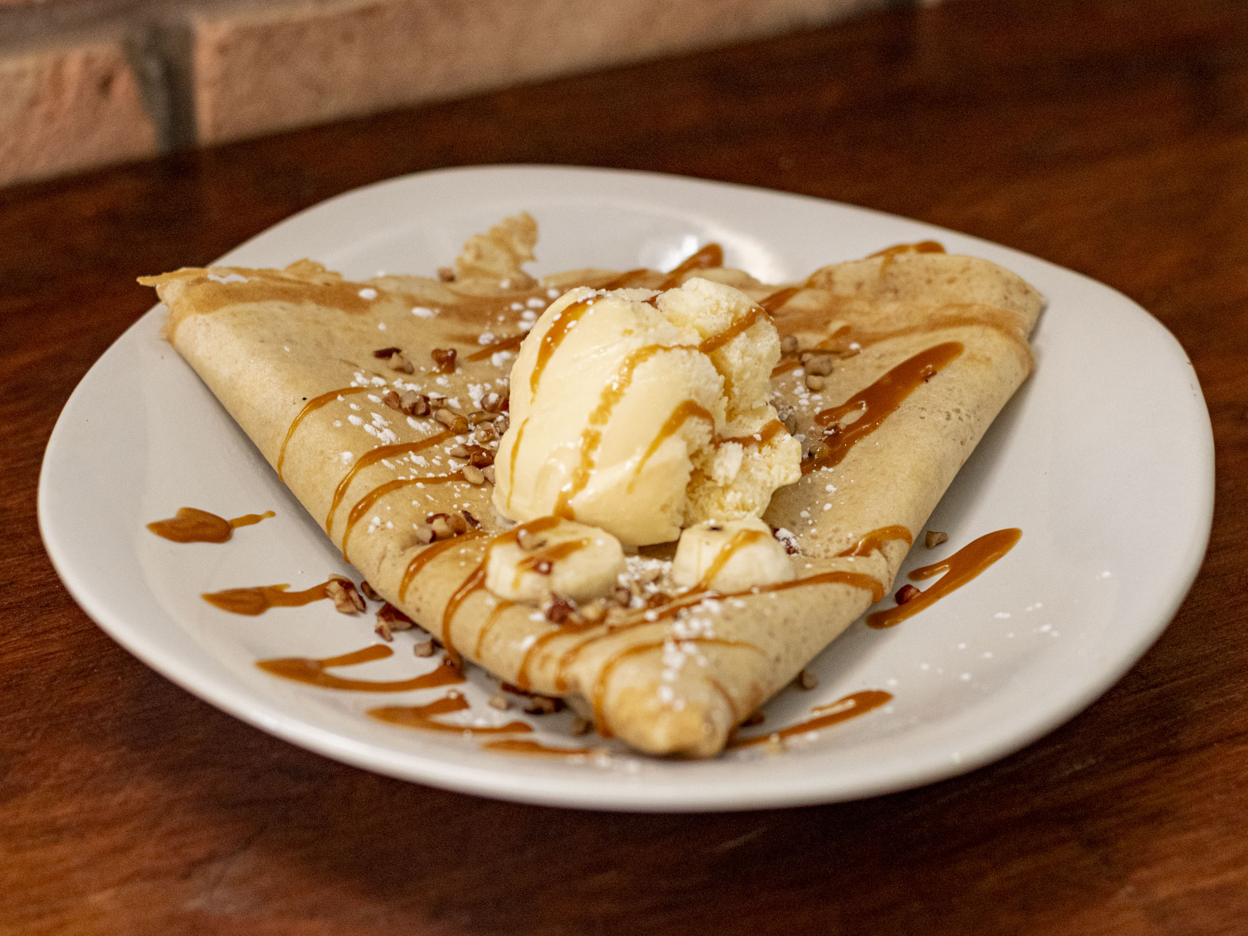 Plátano, nuez y dulce de leche, topeada con dulce de leche y nuez