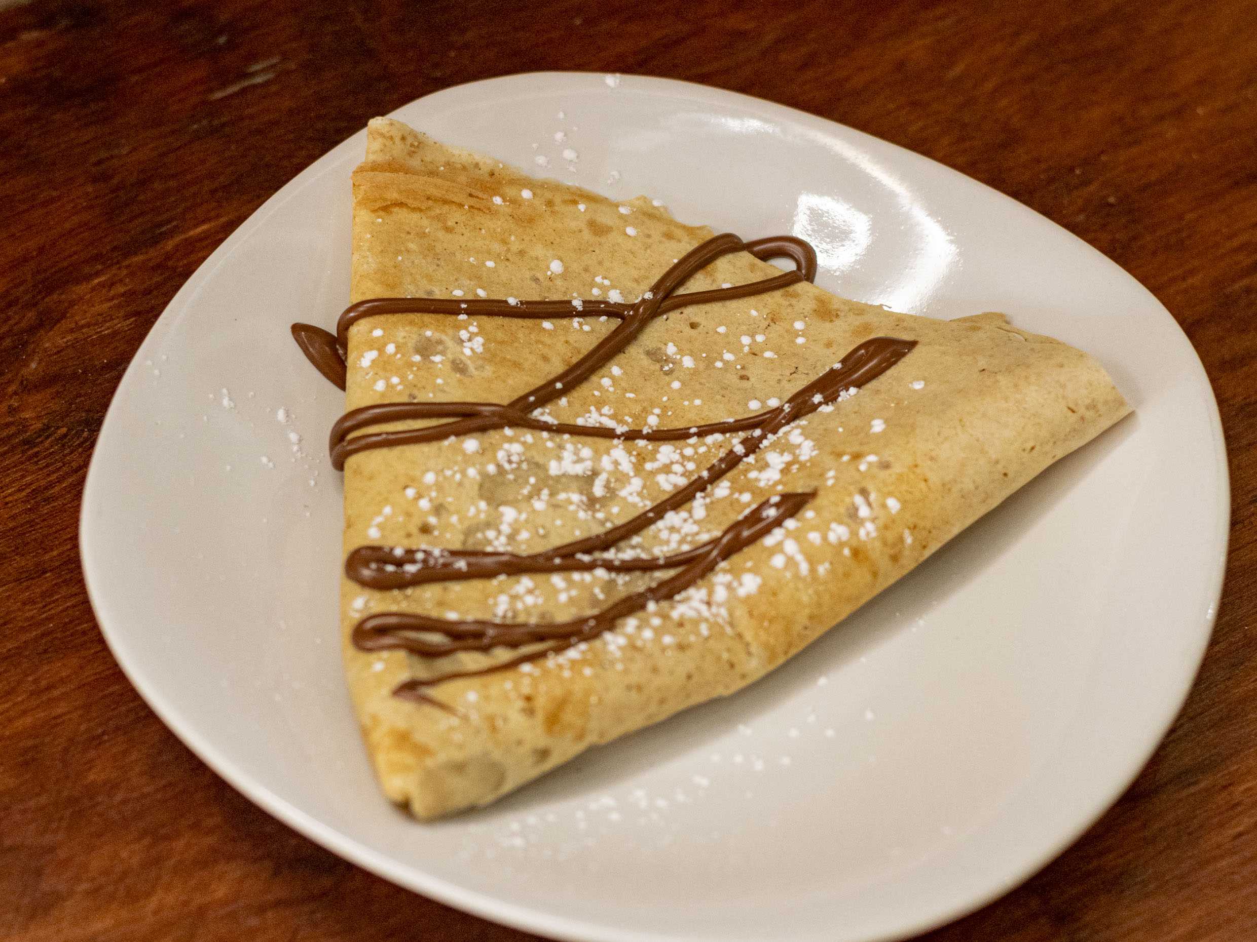 Trozos de pan brioche rebosado, topeado con Nutella, fresa, kiwi y plátano