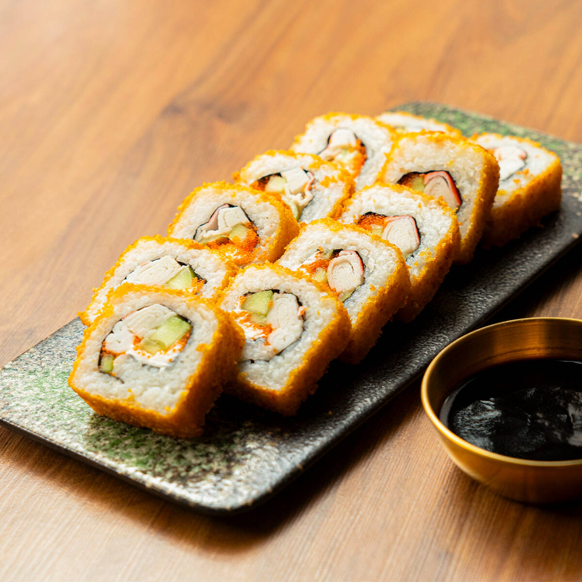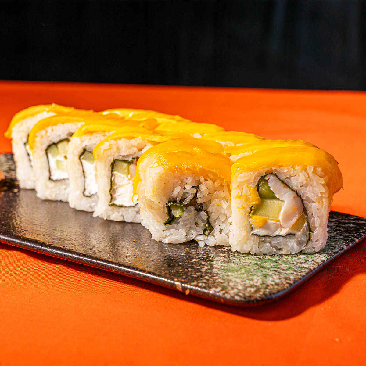 SURIMI, PHILADELPHIA, PEPINO, POR FUERA AJONJOLI CON TOPING DE TAMPICO