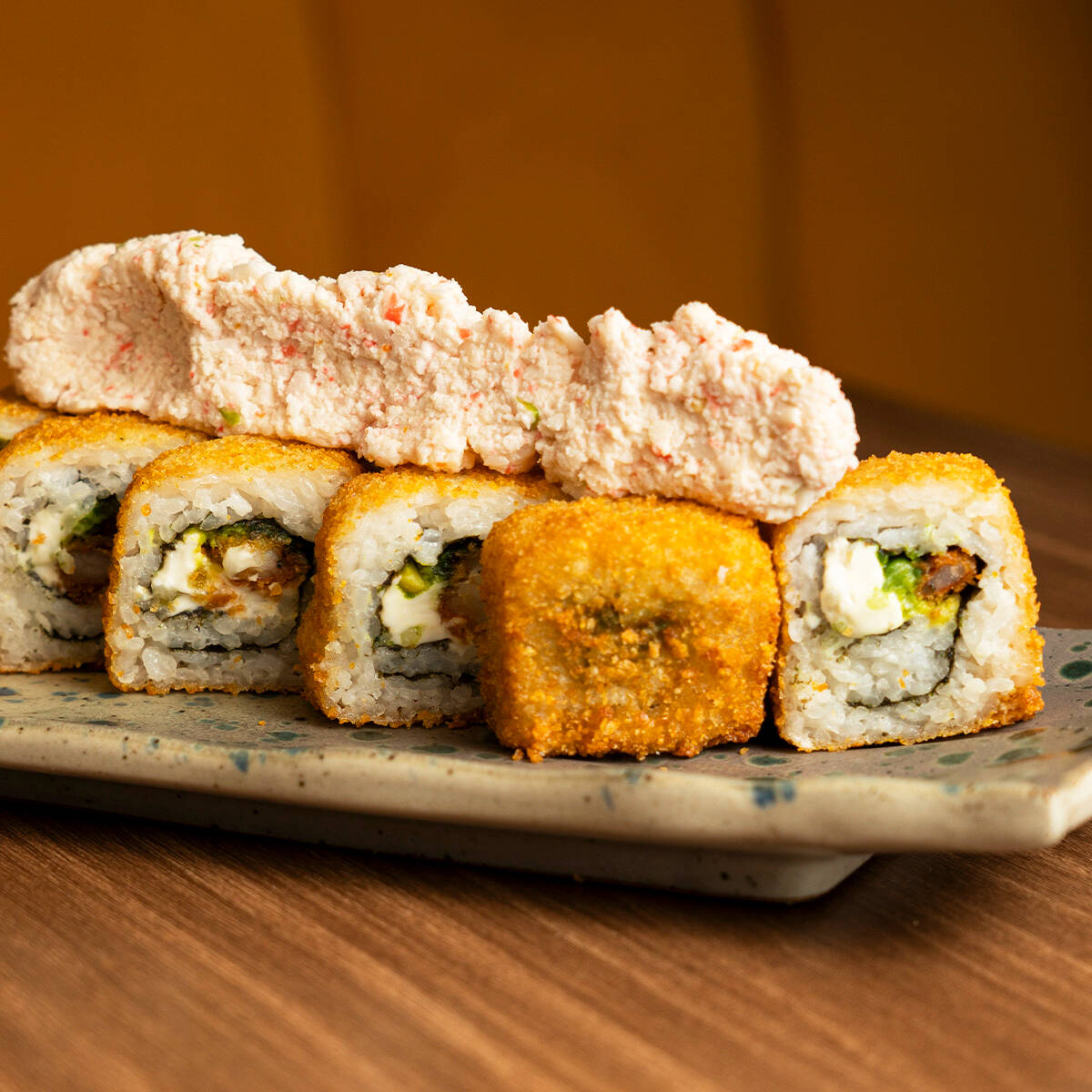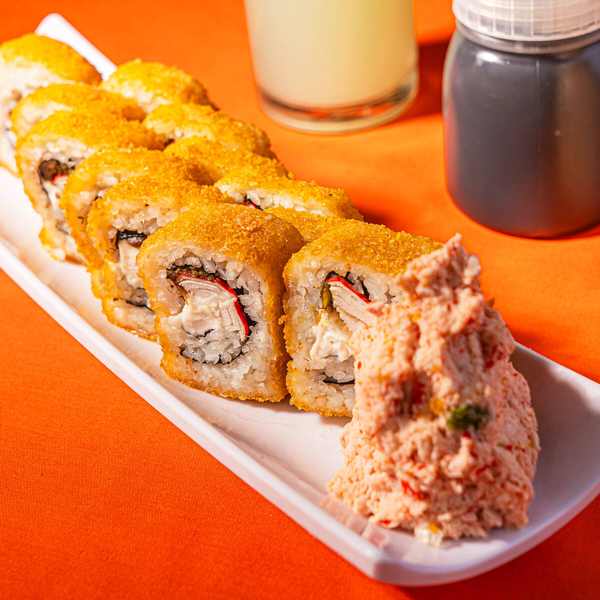 TAMPICO (ENSALADA DE SURIMI) POR FUERA PHILADELPHIA, SURIMI, TAMPICO Y FURIKAKE