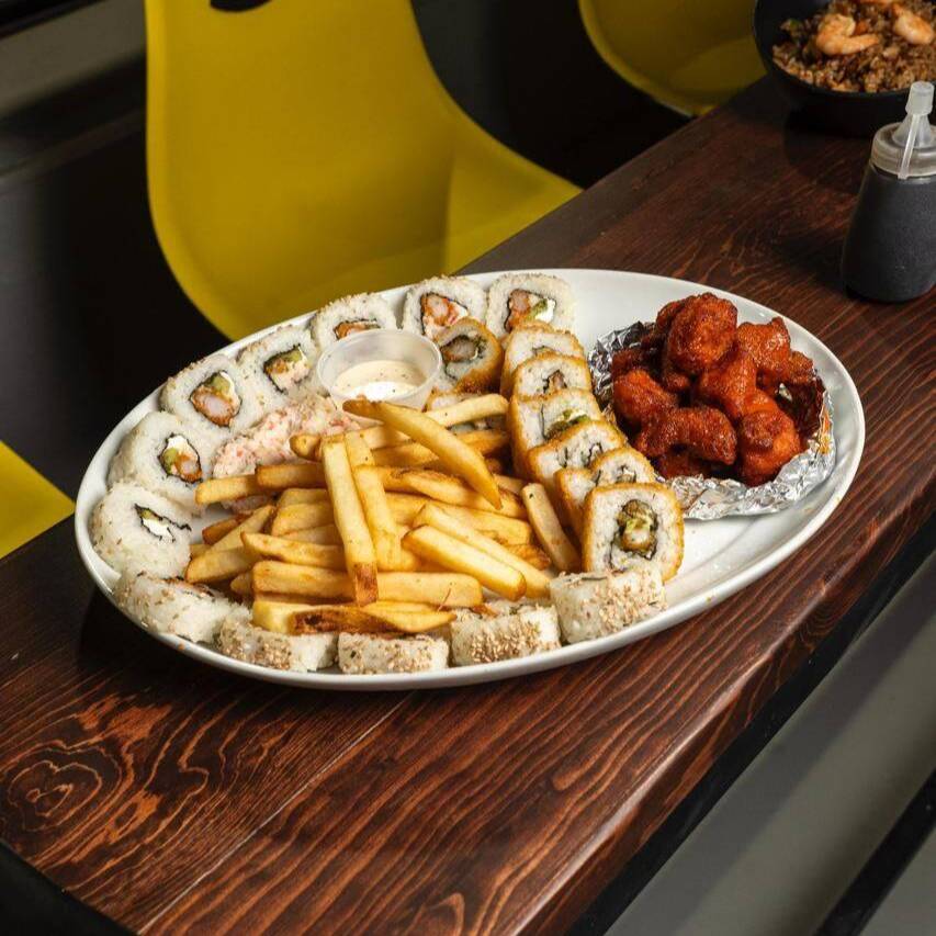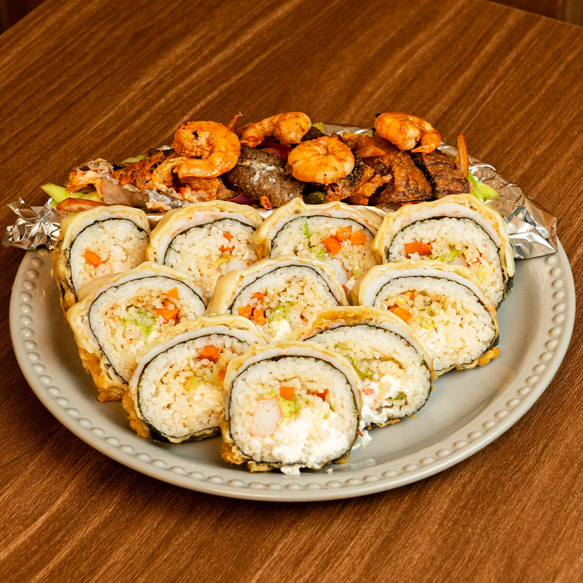 PHILADELPHIA, AGUACATE, POLLO, SIRLOIN, CUBIERTA DE ARROZ FRITO, CON TOPING DE TAMPICO, CAMARONES Y CEBOLLIN