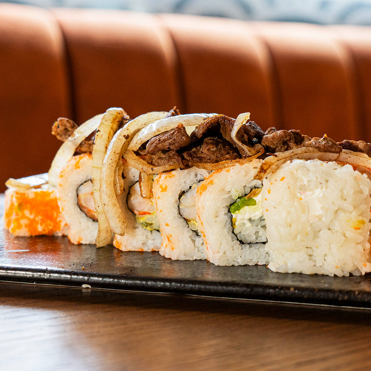 CAMARON, SALMON, PHILADELPHIA, AGUACATE, PEPINO, POR FUERA UNTADO TAMPICO Y MASACO CON TOPING DE SIRLOIN