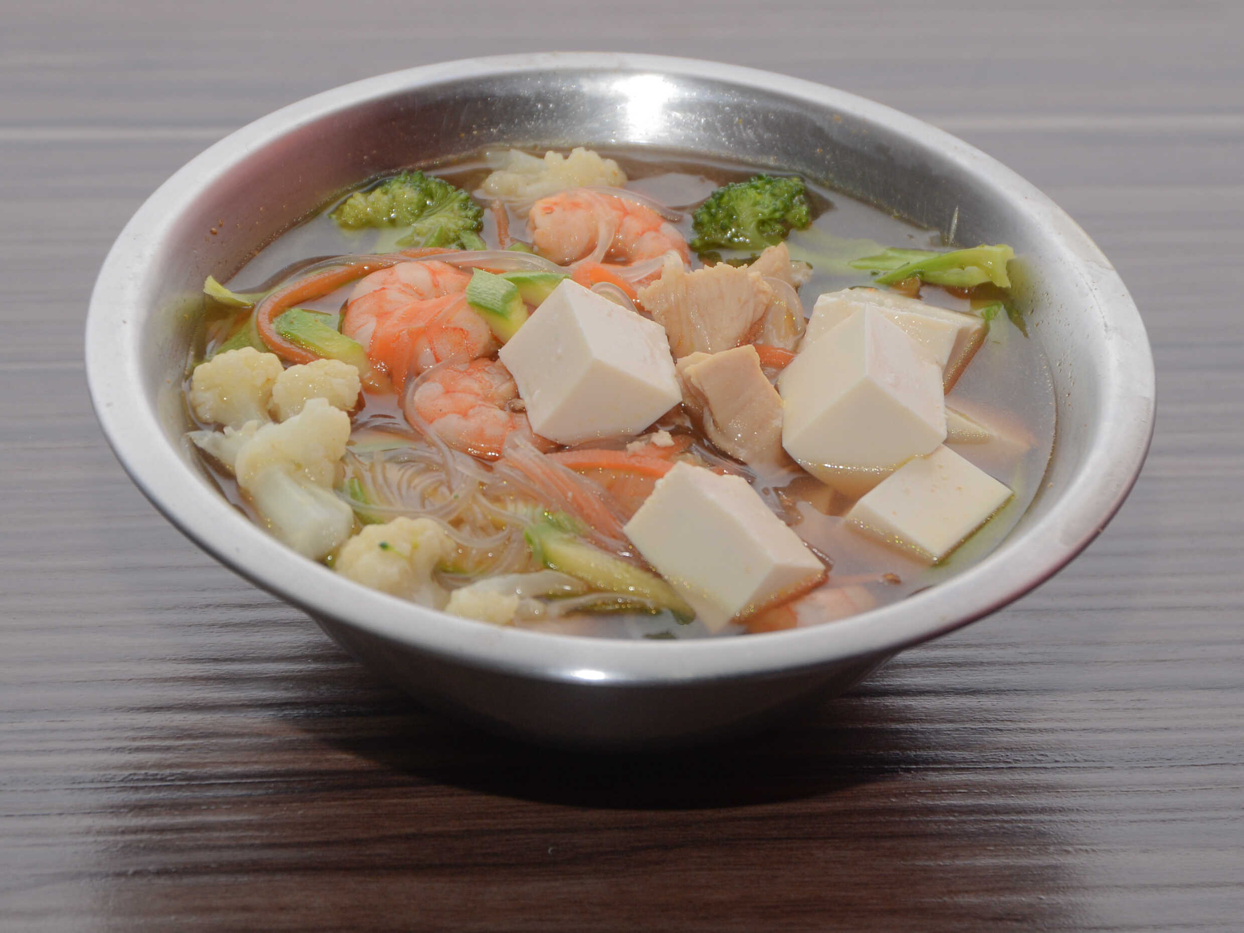 Camarón, pescado, pollo, jaraosamen de soya, germen de soya, brócoli, coliflor, zanahoria, y calabaza.