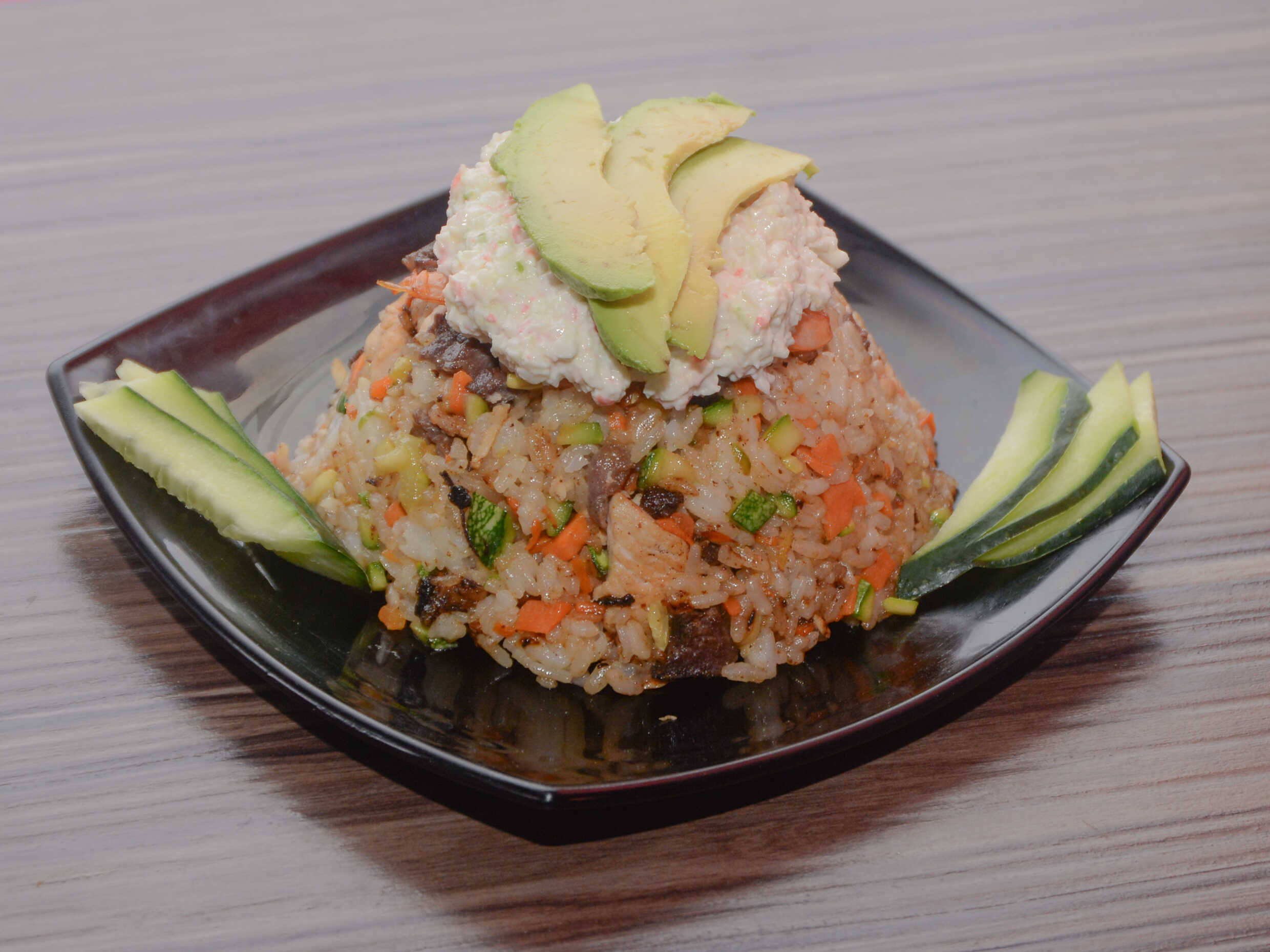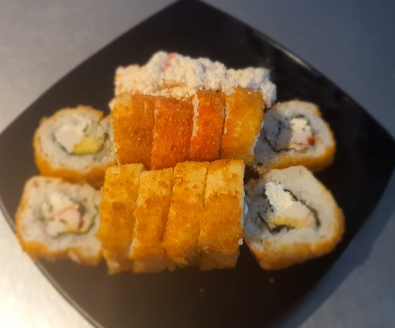 Philadelphia, aguacate, pollo, sirloin , cubierta con arroz frito, empanizada, con topping de tampico, camarones y cebollín.